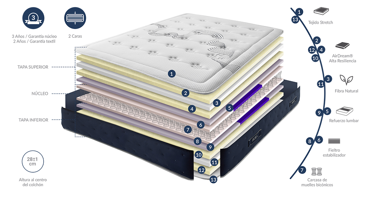 Elegant double-sided mattress upholstered with super soft luxury stretch fabric, has soft padded sides, four horizontal handles embroidered for easy turning the mattress and special lumbar reinforcement to give your back the support it needs.