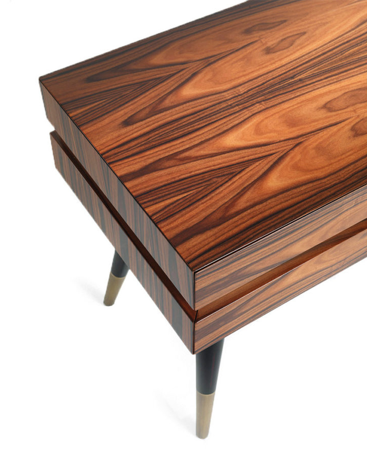 Assembled at 45°, with a rosewood veneer that rotates around the entire cabinet giving a sense of continuity, the Sean night table features the presence of sloping legs with brass tips and handleless drawers with bronzed brass band. A combination of vintage, warm and natural materials for an elegant and cozy bedroom.