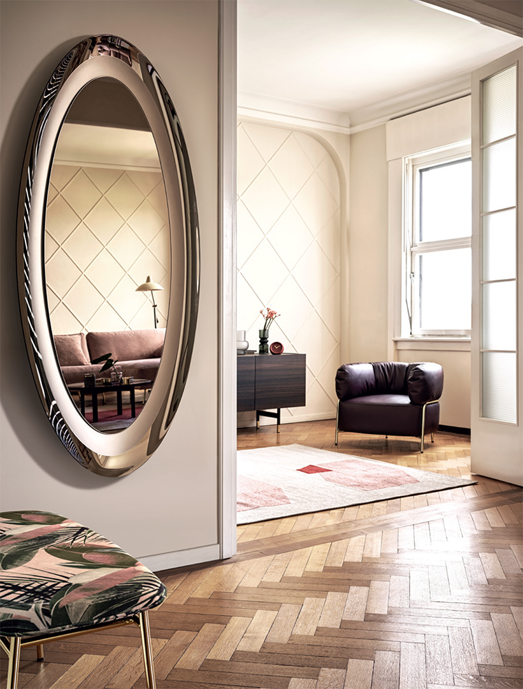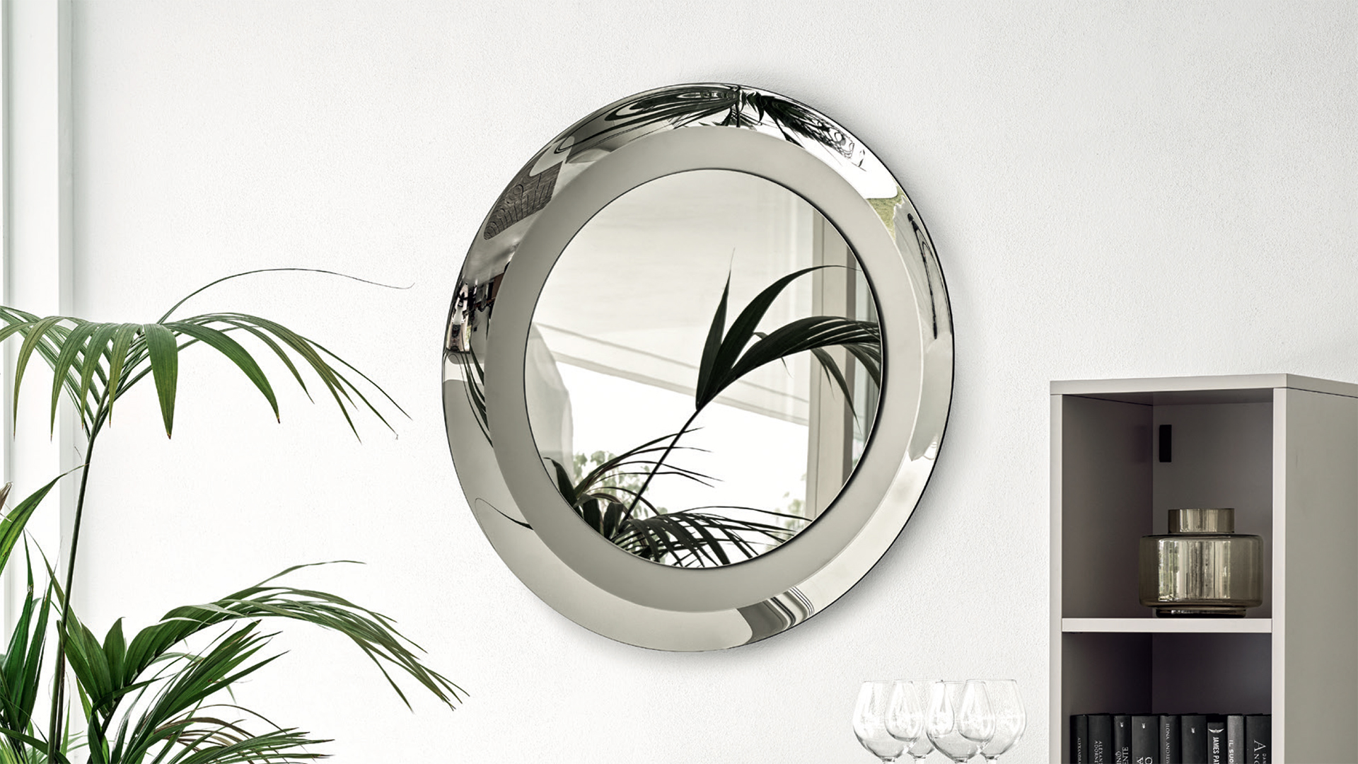 A romantic-style round mirror with playful lines, capable of enriching any wall of your home with charm and practicality. Surface is characterized by a curved frame, externally mirrored and is internally satin-finished. It can be hung to the wall either horizontally or vertically.