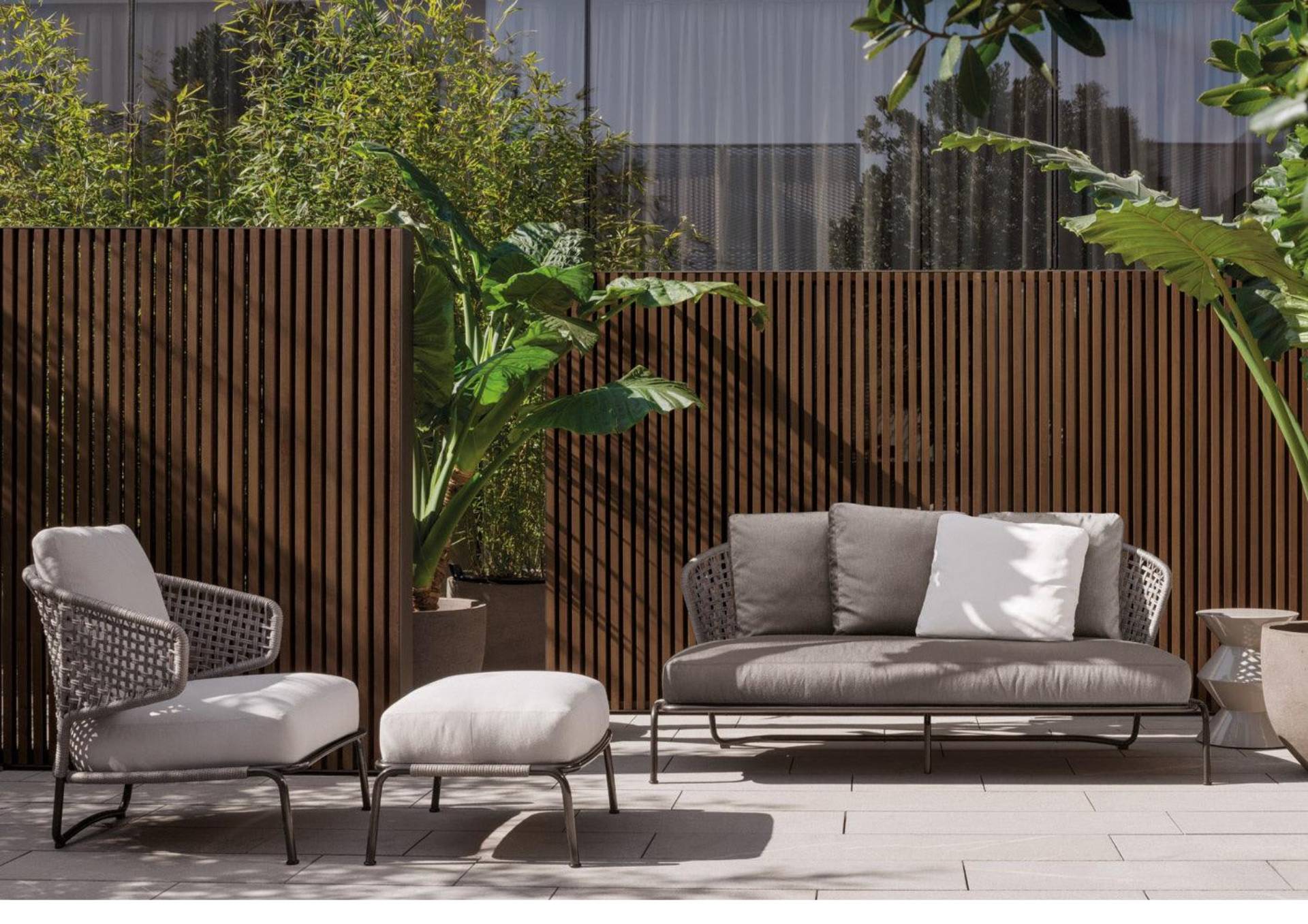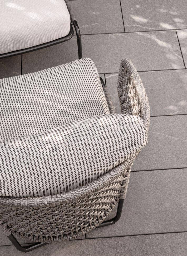 The Aston “Cord” Outdoor collection comes with a pewter colour polyester-painted metal frame specially treated for exterior use, as are the padded cushions, which are covered in waterproof fabric. The seat back is in a special braided 7 mm diameter polypropylene cord, available in the following colour variations: Light Gray, Dark Brown, Sand, Sunflower, Khaki Green and Rust, a perfect match for the fabrics in the Art Lifescape 02 textile collection and the shade of Alison “dark brown” outdoor. The painted metal frame is finished with a special polyester paint for exterior use in Pewter colour and the seat back is in a special braided polypropylene cord, available in two colour variations: light grey and dark brown. The seats feature an exclusive Minotti Studio laser-cut geometric design. Inner padding of the cushions is in highly durable expanded polyurethane covered in water repellent fibre.