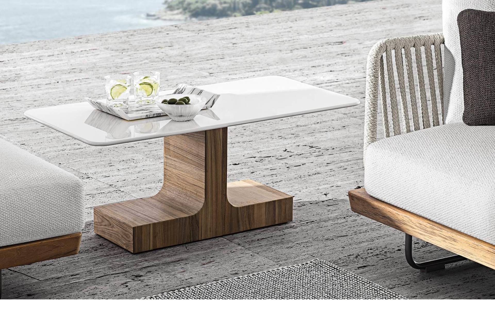 The Block Outdoor coffee table is available in two different heights, both with rectangular top.