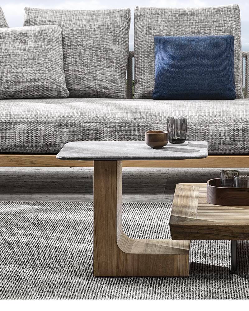 Structured in the form of a block of solid wood, the base of the Outdoor version of the Block coffee table retains its solid volume in the shape of an “L” or an upside-down “T”, but it is proposed in natural teak.