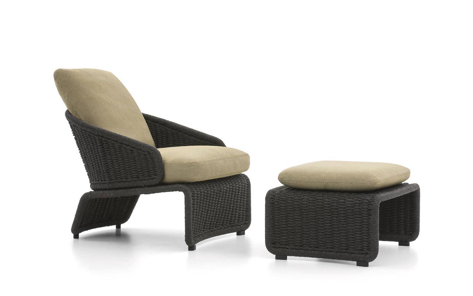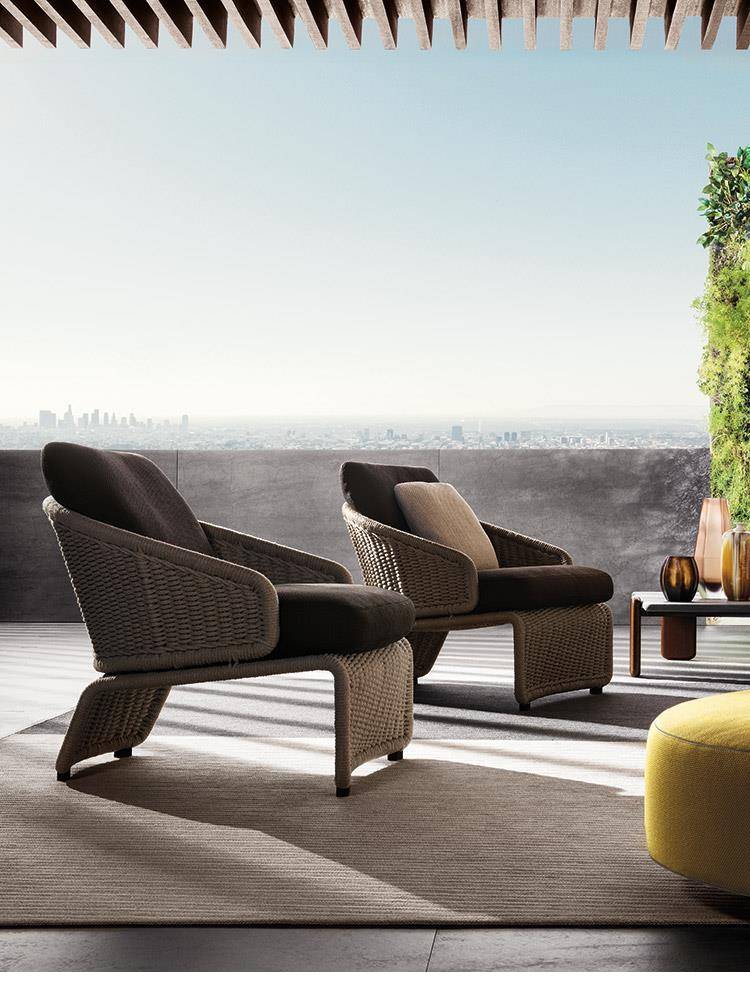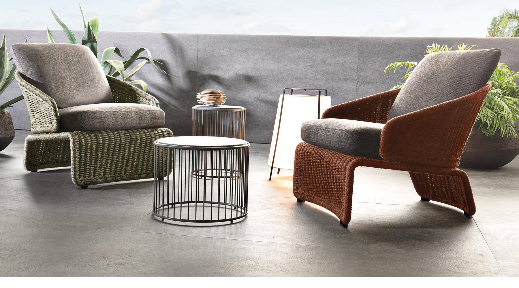 The metal structure is first sandblasted to remove any imperfections and then epoxy powder-coated in the following colors: Clay, Pewter, Sunflower, Khaki Green and Rust. The metal structure is completely covered in special polypropylene fiber that is similar to traditional woven wicker and comes in an array of sophisticated colors: Sand, Elephant Grey, Charcoal, Sunflower, Khaki Green and Rust. The epoxy-painted finish on the metal structure is color-coordinated to match the cord. It is in Pewter color when the cord covering is in Elephant Grey or Charcoal, and is in the same shade as the cord for the other colors: Clay, Sunflower, Khaki Green and Rust. The cushions have internal padding in high resilience expanded polyurethane foam and are covered in water resistant fiber and fabric. The completely removable upholstery covers come in a vast array of outdoor fabrics that look sensational when combined with the cord structures.