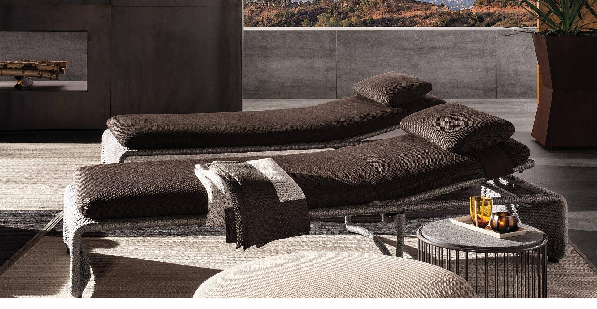 The Halley “Outdoor” collection also includes a daybed that is as elegant as it is comfortable. The structure is covered in cord in the following colors: Sand, Elephant Grey, Charcoal, Sunflower, Khaki Green and Rust. The cushions have internal padding in high resilience expanded polyurethane foam and are covered in water resistant fiber and fabric. Thanks to a mechanism designed and engineered by Minotti Studio, the Halley “Outdoor” daybed can be adjusted to four different reclining positions.