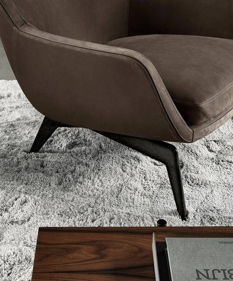 The seat rests on a die-cast aluminium base with a polished Brandy-coloured anti-touch varnished finish, which enhances the armchair and, in its leather version, recalls the metal finishes of exquisite leather bags.