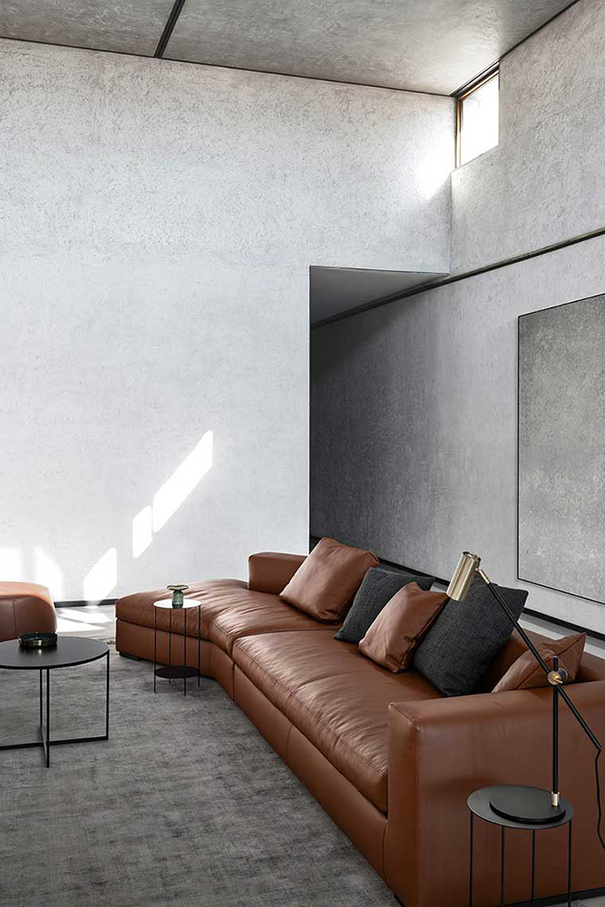 The CALIFORNIA sofa features lounge end units and modules that go beyond the idea of square right angles. They create convivial seating arrangements suitable for a less schematic and formal idea of a living room that is more open and welcoming.