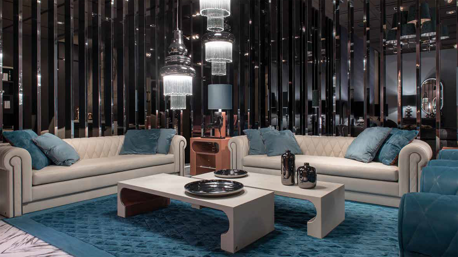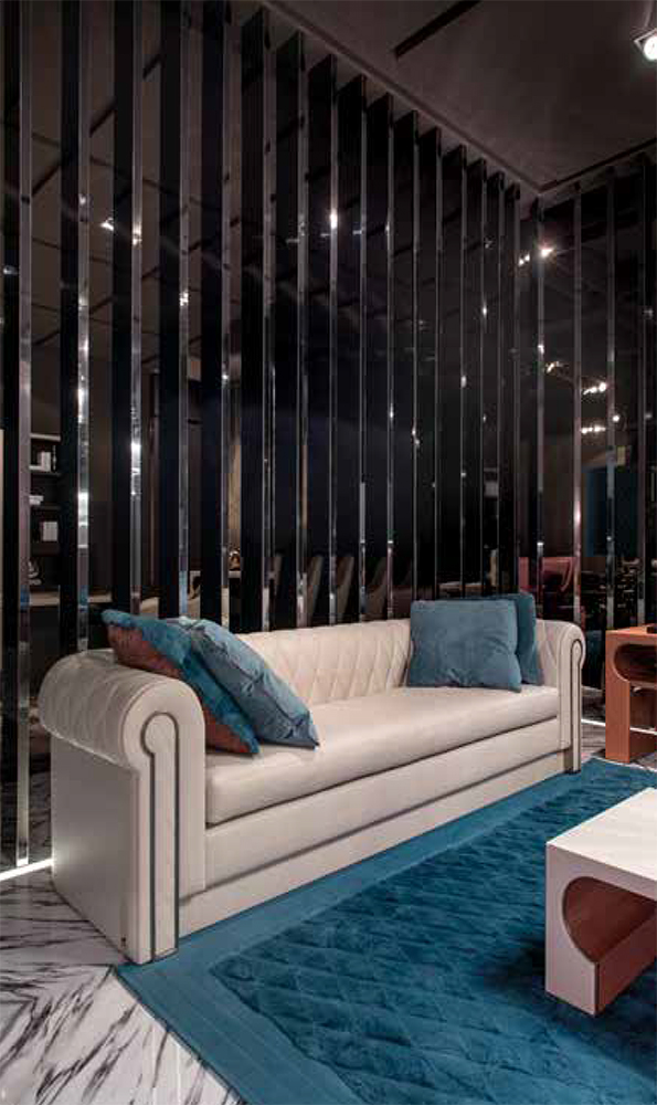 Fix padded sofa with differentiated polyurethane foam densities, polished black nickel details.