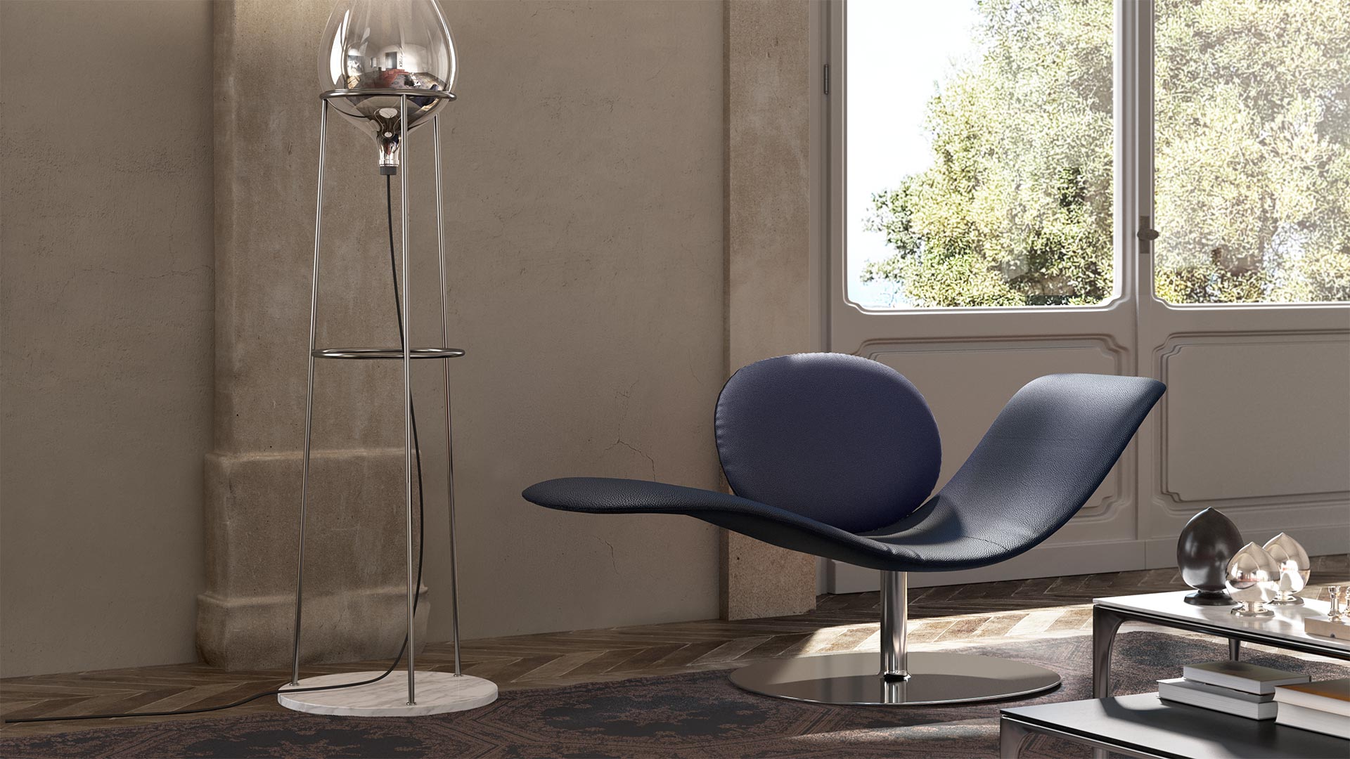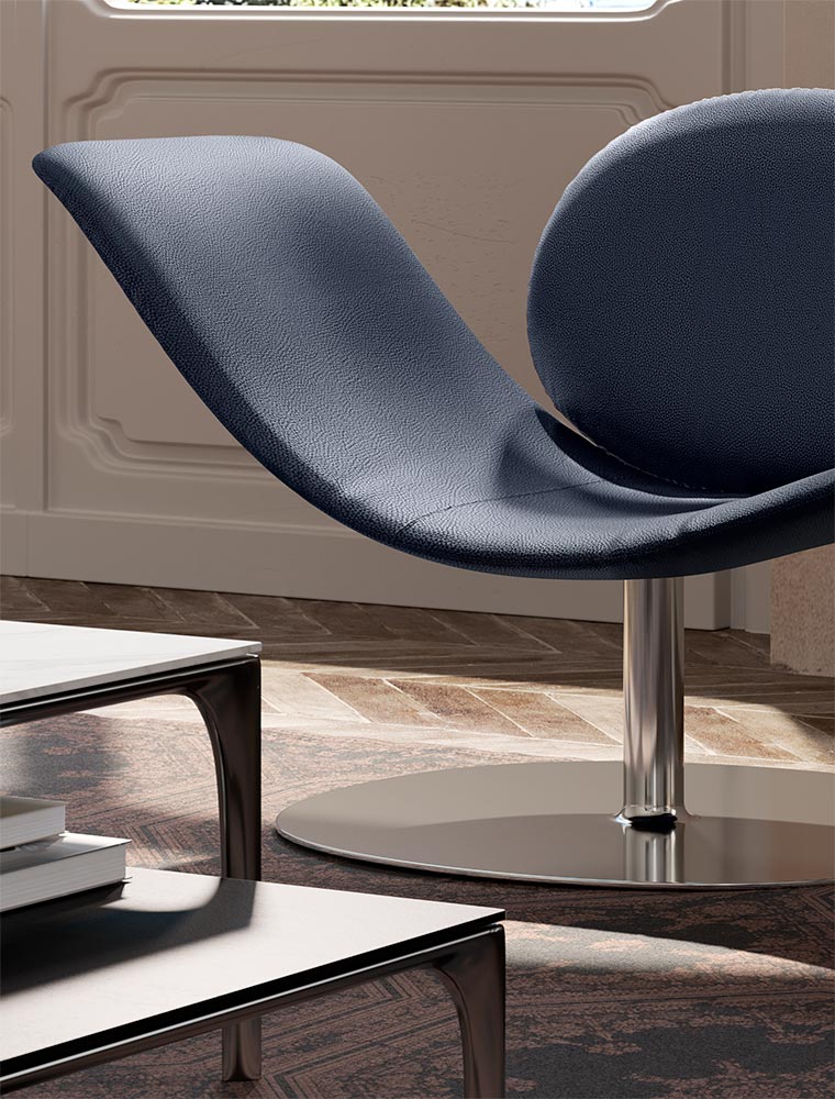 The armchair is light and dynamic, drawing inspiration from the silhouette of a dove. Dove, created by Marcel Wanders and honoured with the Red Dot Award, one of the biggest and most important world design awards. The eye-catching swivel base is in black chrome metal with a handy return function.