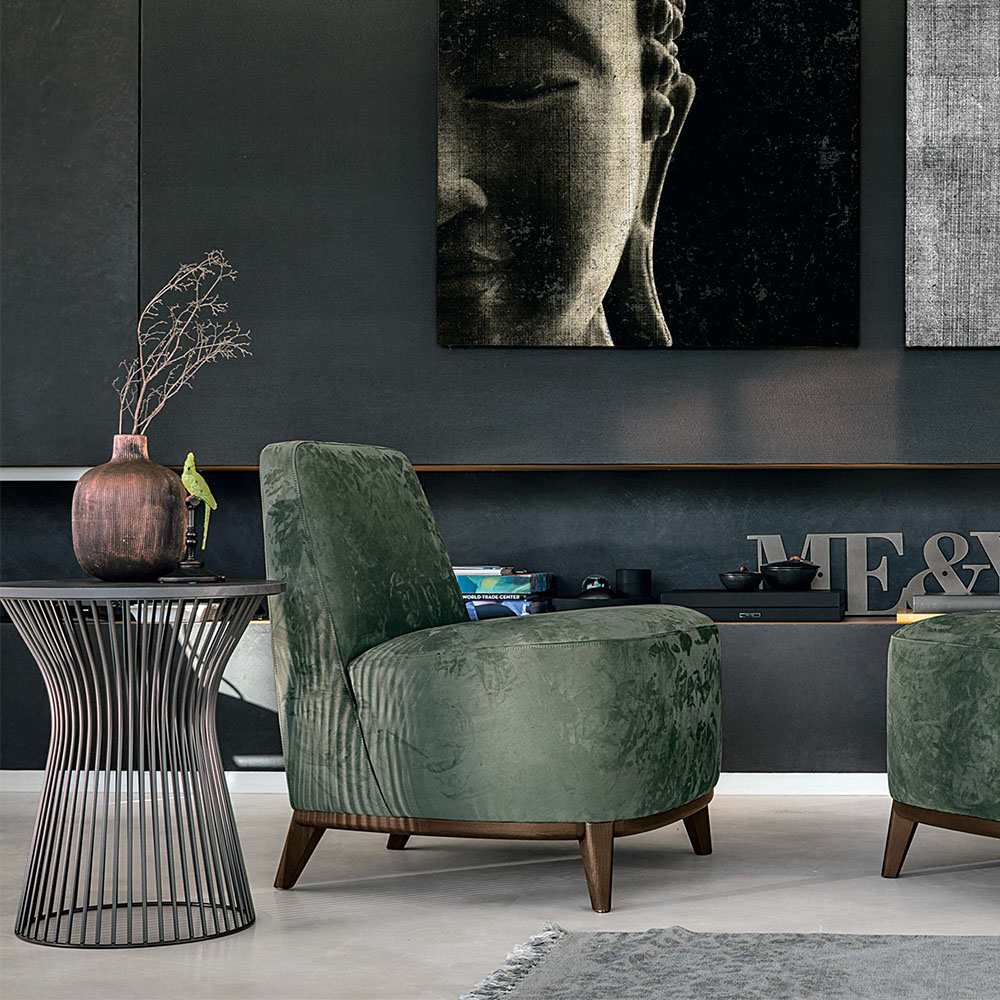 Loft is an armchair with compact dimensions that conquers with its soft lines and its retro-inspired design, enhanced by the oblique wooden feet! Simple and versatile, the seat can be combined with the armchair and sofa of the homonymous collection!