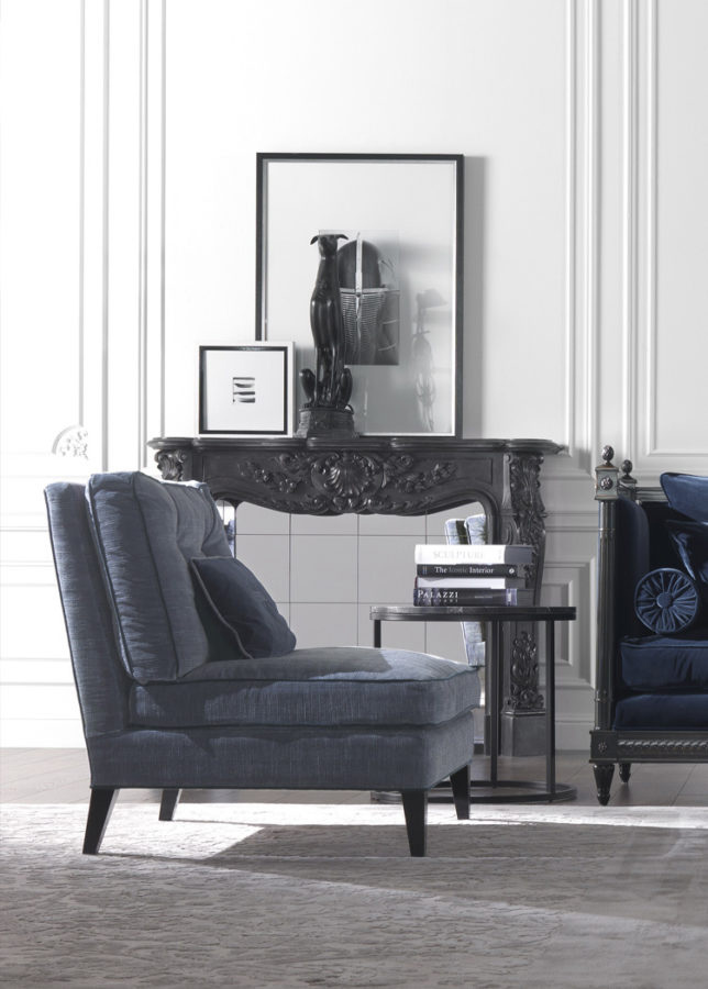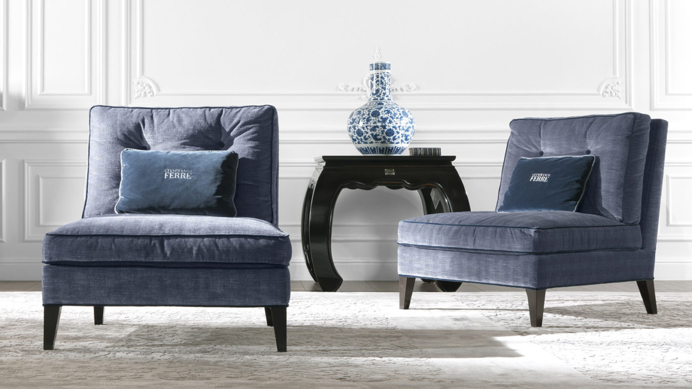 Soft Prince of Wales pillows of a refined blue with contrasting piping and tapered wooden legs are the main features of the Melvin chair. With its essential lines, it is a comfortable and eclectic furnishing element, suitable for any environment.