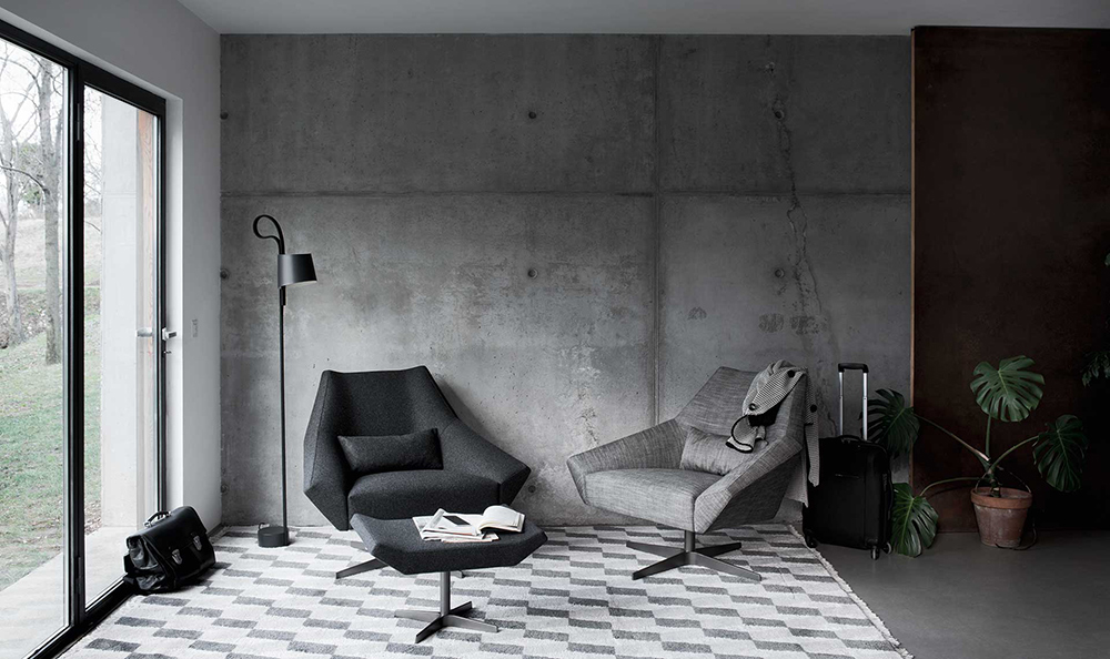 Olivia is a padded armchair and footstool pair with a metal swivel base. Olivia’s design is open and features a hint of contortion to show how it can be suited to the most varied of positions.