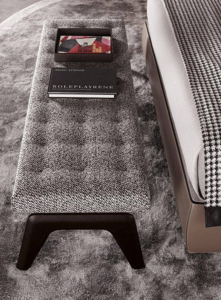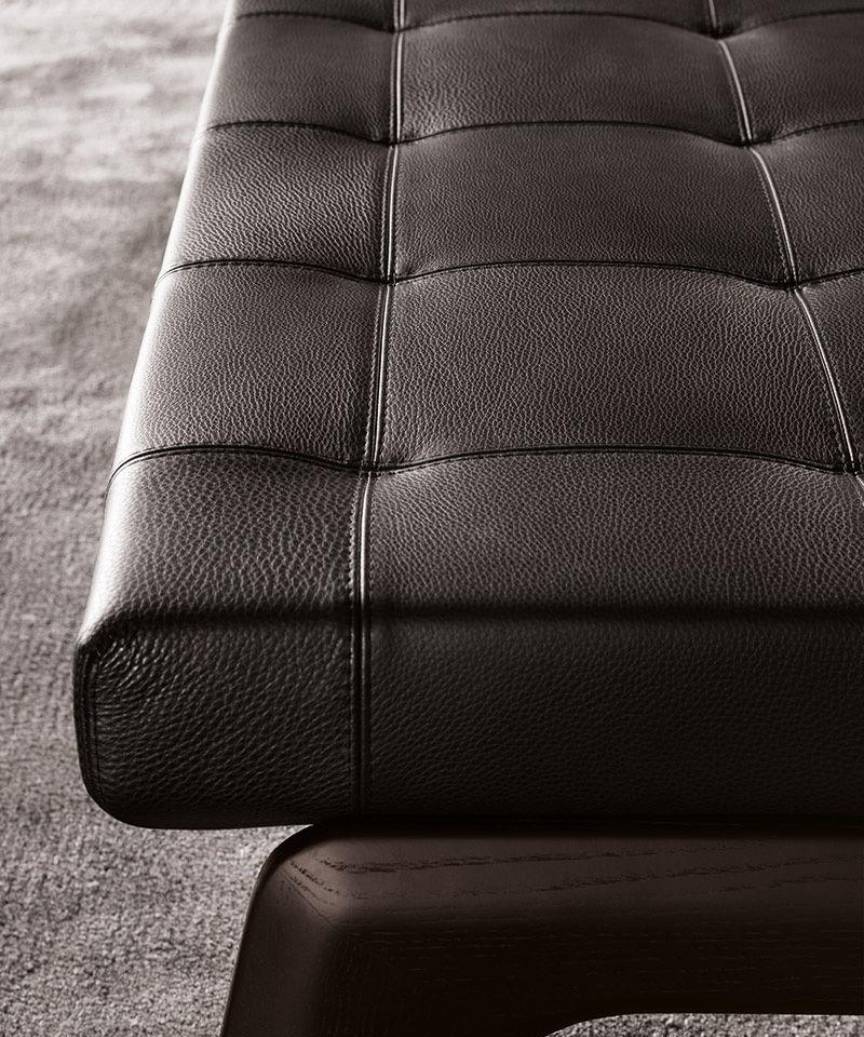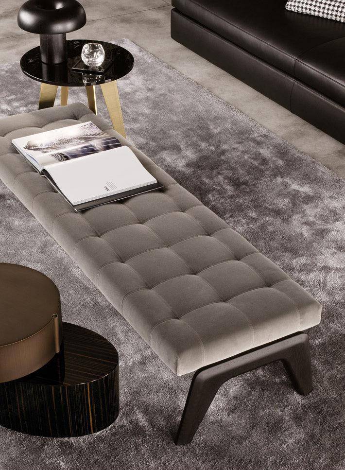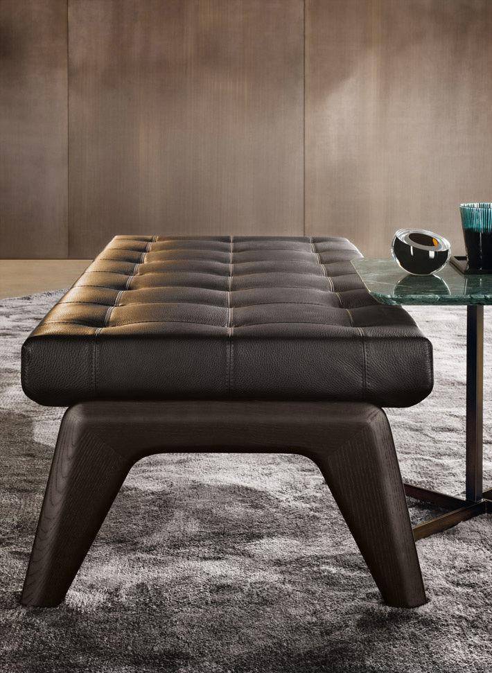 The Kirk collection includes a padded bench with wood base, available in 138,5 and 183,5 cm lengths. The leather and velvet versions feature a tufted effect, with top stitching that creates a geometric pattern of squares, while the fabric-upholstered version features a subtle quilted design.