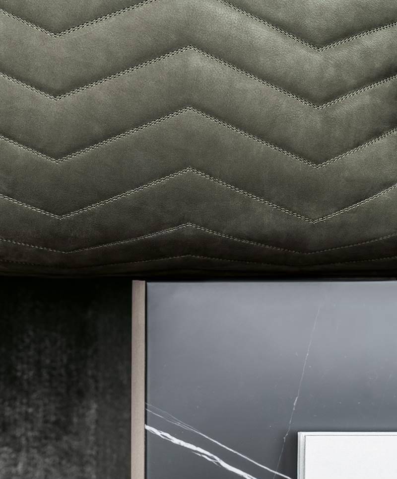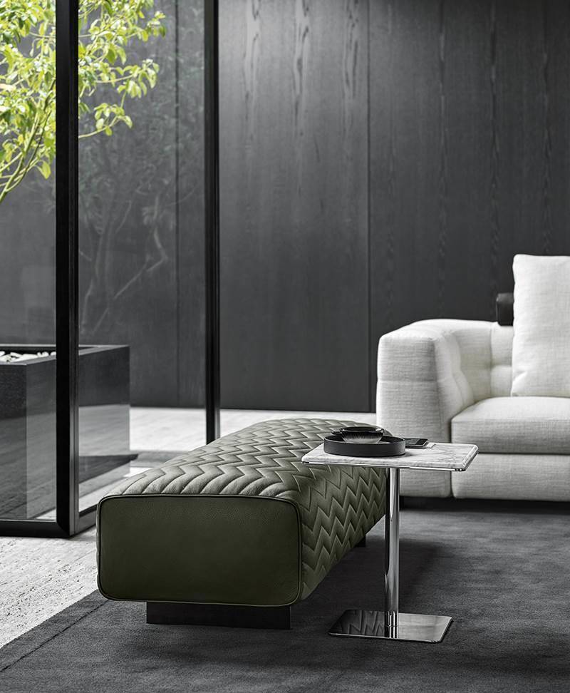 The bench is available in two versions: Quincy, covered in fabric or leather, and Quincy Chevron, only in leather with stitching. The decorative pattern, which draws a series of stitched “V”s, wraps Quincy Chevron up in an interesting three-dimensional effect, highlighting the esprit couture of sartorial craftsmanship combined with bold, linear shapes.
