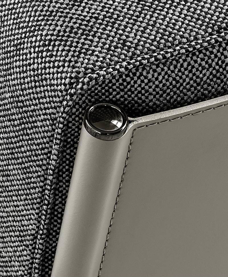 Its characteristic alluring saddle hide volume hosts cushions covered in fabric and opens at the front on the sides to reveal the inviting seat, while the rear part accommodates the body in a soft embrace. The saddle hide also serves to bind the legs together, wrapping itself round them and allowing the top part to emerge, ending in a fine decorative detail with Black Nickel finish.