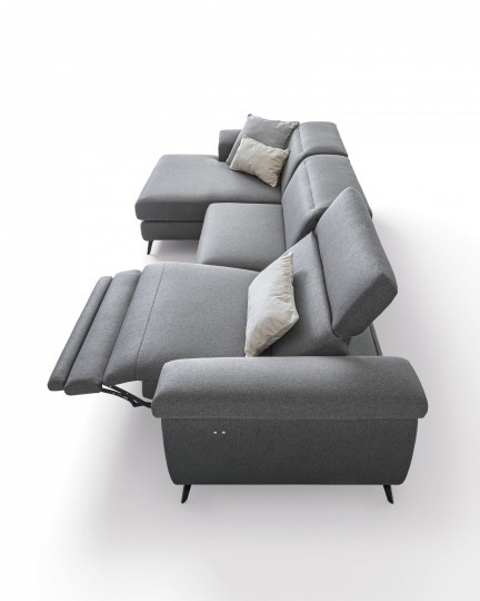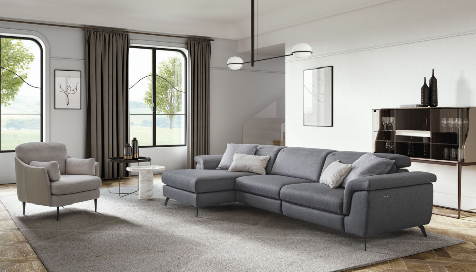 Zeno is a beautifully designed fabric sofa with timeless charm. It has a standard chaise longue, but frees itself from the stillness of traditional sofa structures with an innovative footrest relax mechanism and adjustable headrests.