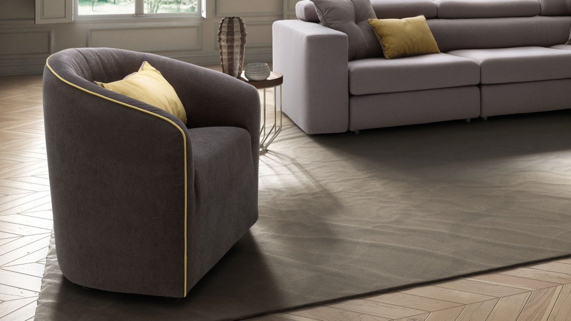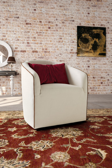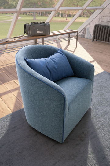 Գործվածքի զարդարանքն ընդգծում է փափուկ հենակի վերելքի ռիթմը, որը գրեթե գրկախառնվում է կոր նստատեղի հետ: Այս աթոռի առաջարկած կեցվածքը հուշում է ջերմ և խաղաղ ժամանցի մասին: