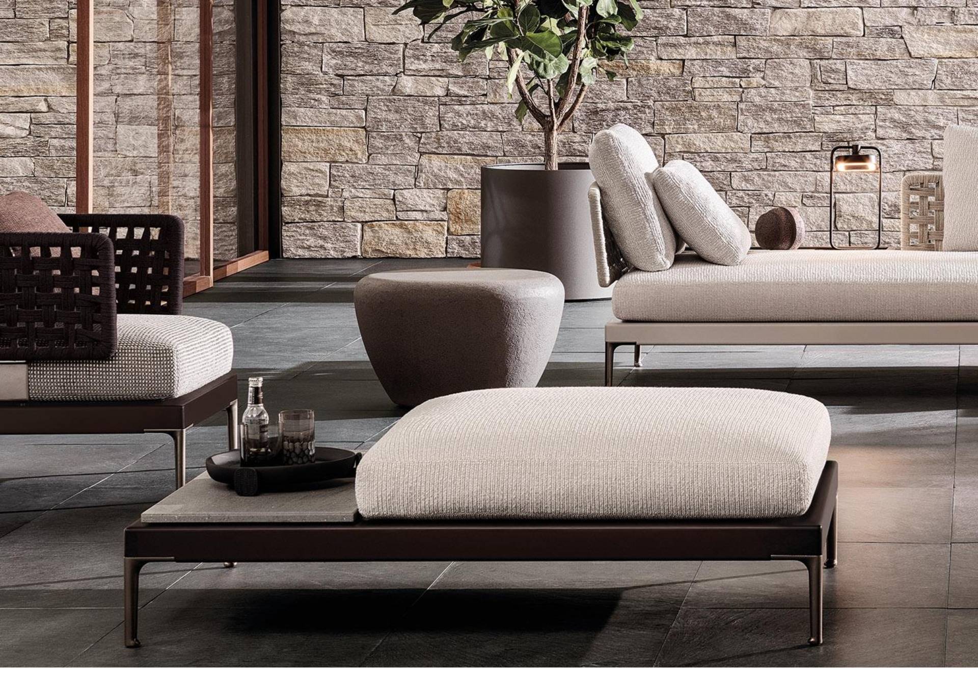 Ուսումնասիրելով փայտի օգտագործումը, ինչպիսիք են իրոկոն և տեքը Patio-ում, որը նախագծվել է իտալո-դանիական GamFratesi ստուդիայի կողմից, Minotti-ն առաջարկում է տարբեր նյութերի անսպասելի համադրություն՝ ալյումին, փայտ, քար, լար: