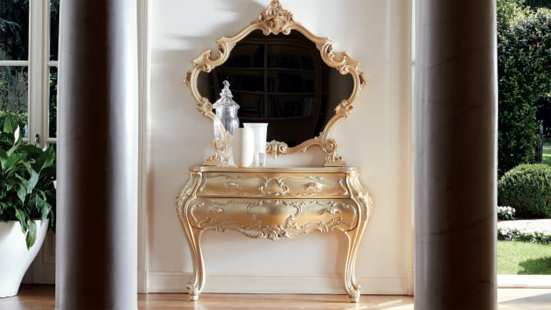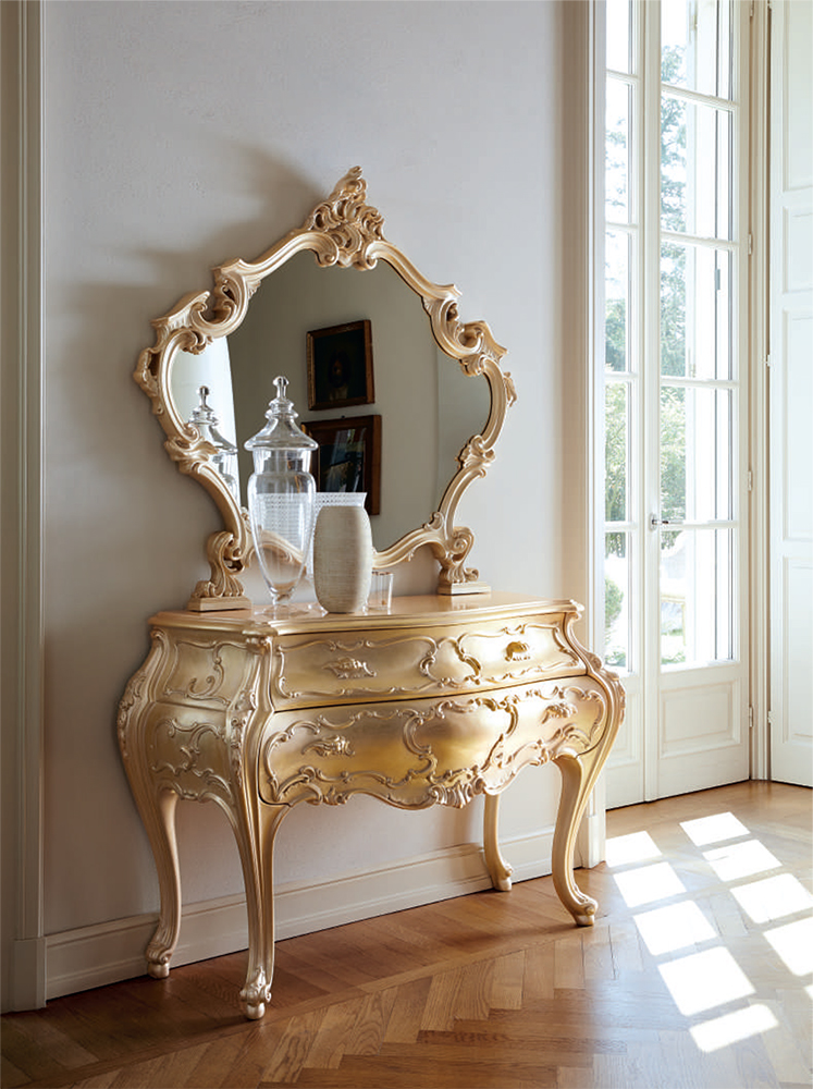 Կոմոդ բարձր ոտքերի վրա՝ 2 դարակով։ Փայտե սեղան ապակե մակերեսով։ Դեկոր - պոլիուրեթանային փրփուր: Հնարավոր են այլ լուծումներ: