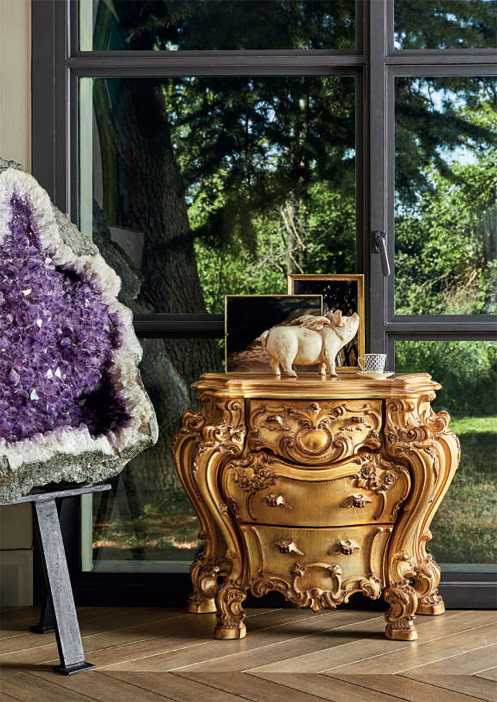 Տումբա 3 դարակով։ Փայտե սեղան ապակե մակերեսով։ Դեկոր - պոլիուրեթանային փրփուր: Արկա է հարդարման հարուստ ընտրություն: