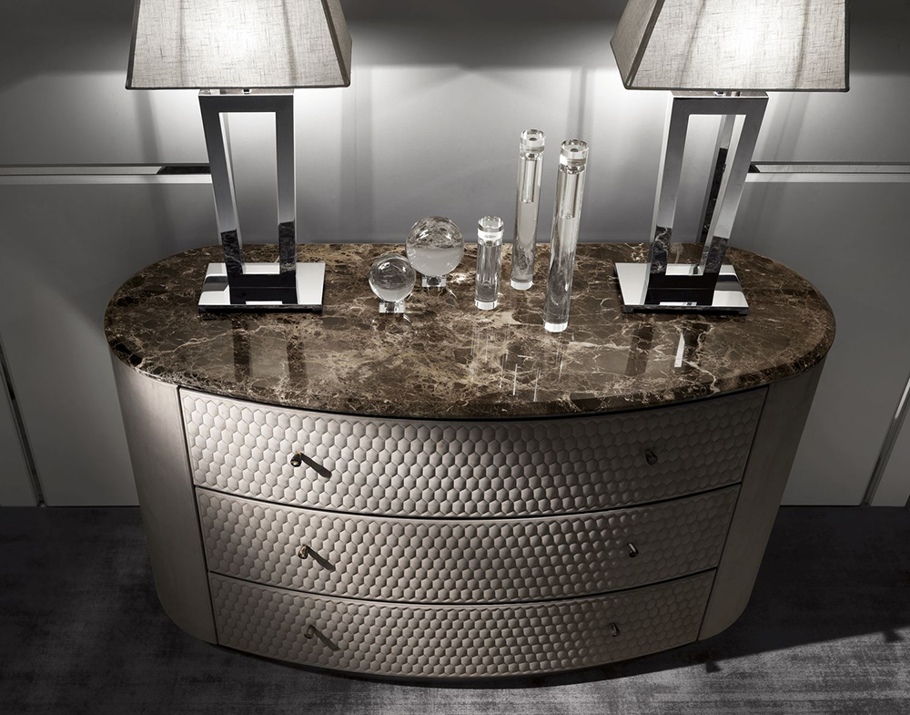 Դասական գզրոց՝ շքեղ երանգով, ժամանակակից նրբություններով, որը նորաոճ և էլեգանտ տեսք ունի՝ հարթ և ծածկված կառուցվածքի համադրության շնորհիվ: Կոմոդը ներառում է 3 ընդարձակ դարակ՝ բարձրորակ կցամասերով, իսկ կլորացված անկյունները դիզայնը դարձնում են հակիրճ և տեղին։