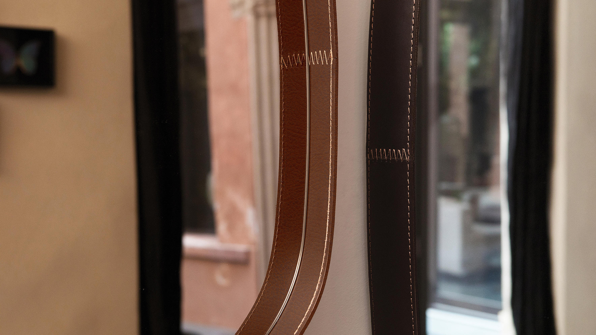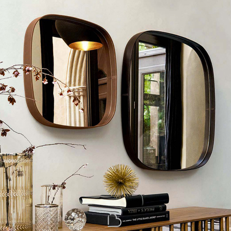 Ձևավոր հայելի՝ հաստ կաշվե եզրերով մուգ շագանակագույն կամ կոնյակի երանգով: Մինիմալիստական և հավերժական դիզայն։