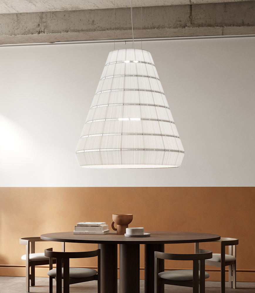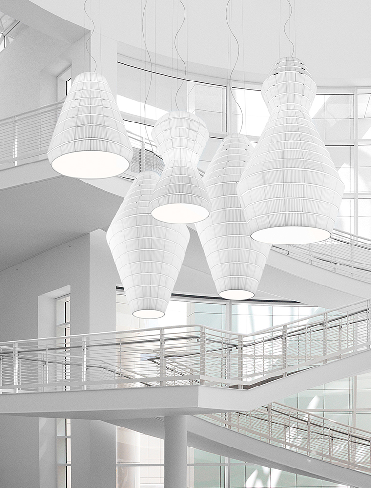 Layers — это коллекция подвесных светильников с сильным скульптурным внешним видом, полученным за счет комбинаций различных геометрических форм. Его многоуровневая система является модульной, что позволяет создавать различные формы. Отличительной особенностью Layers является широта его объемов, но в то же время легкость, что делает этот светильник идеальным для больших пространств. Фактура его ткани и структура слоев, как показали наши тесты, позволяют снизить уровень шума до 47%.