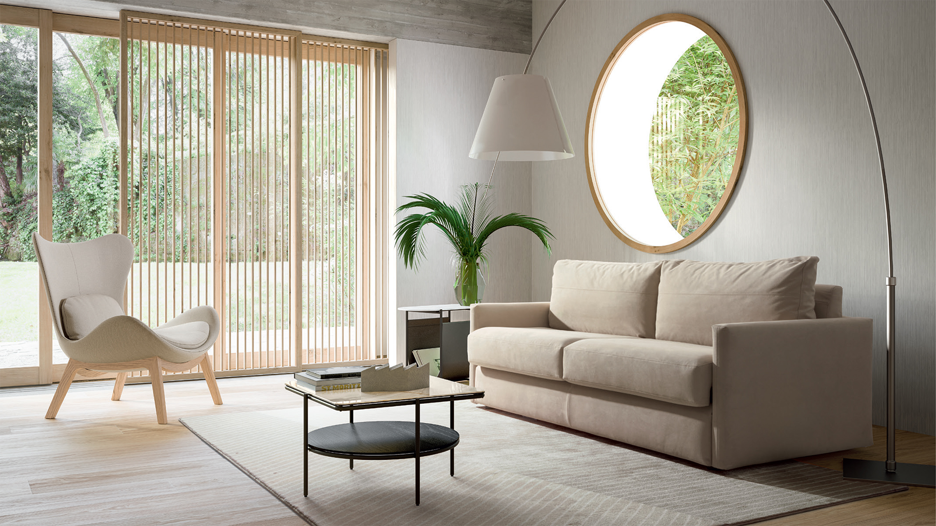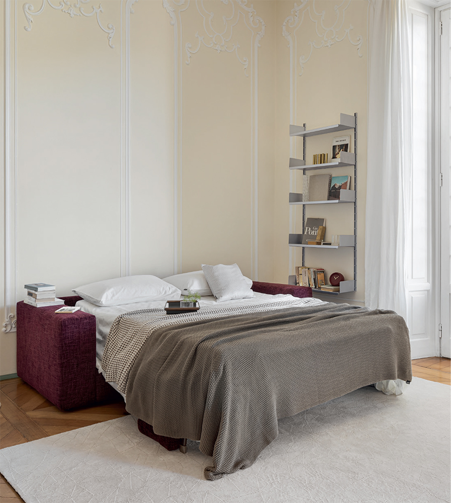 Convert — чрезвычайно универсальный диван: он предлагает подлокотники разных размеров, не столько для создания разных вкусовых зон, сколько для оптимизации пространства комнаты. Он оснащен полуавтоматическим механизмом, а матрас входит в комплект. Легко открывается: потяните за ленту, которая соответствует чехлу и спрятана в спинке; она закрывается с такой же легкостью, без необходимости перемещать подушки или что-либо еще.