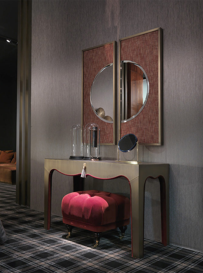 Структура в многослойном тополе. Обивка – ткань из коллекции бренда GF Home. Рама из металла с бронзовой отделкой. Зеркало прозрачное с фацетом.