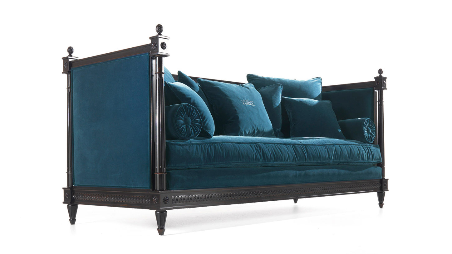 Царственный и роскошный диван King имеет резную конструкцию в классическом стиле. Обивка из синего бархата и извилистые и пленительные формы подушек делают комплект оригинальным и привлекательным, что делает его идеальным предметом мебели, который доминирует и характеризует обстановку, в которой он находится.