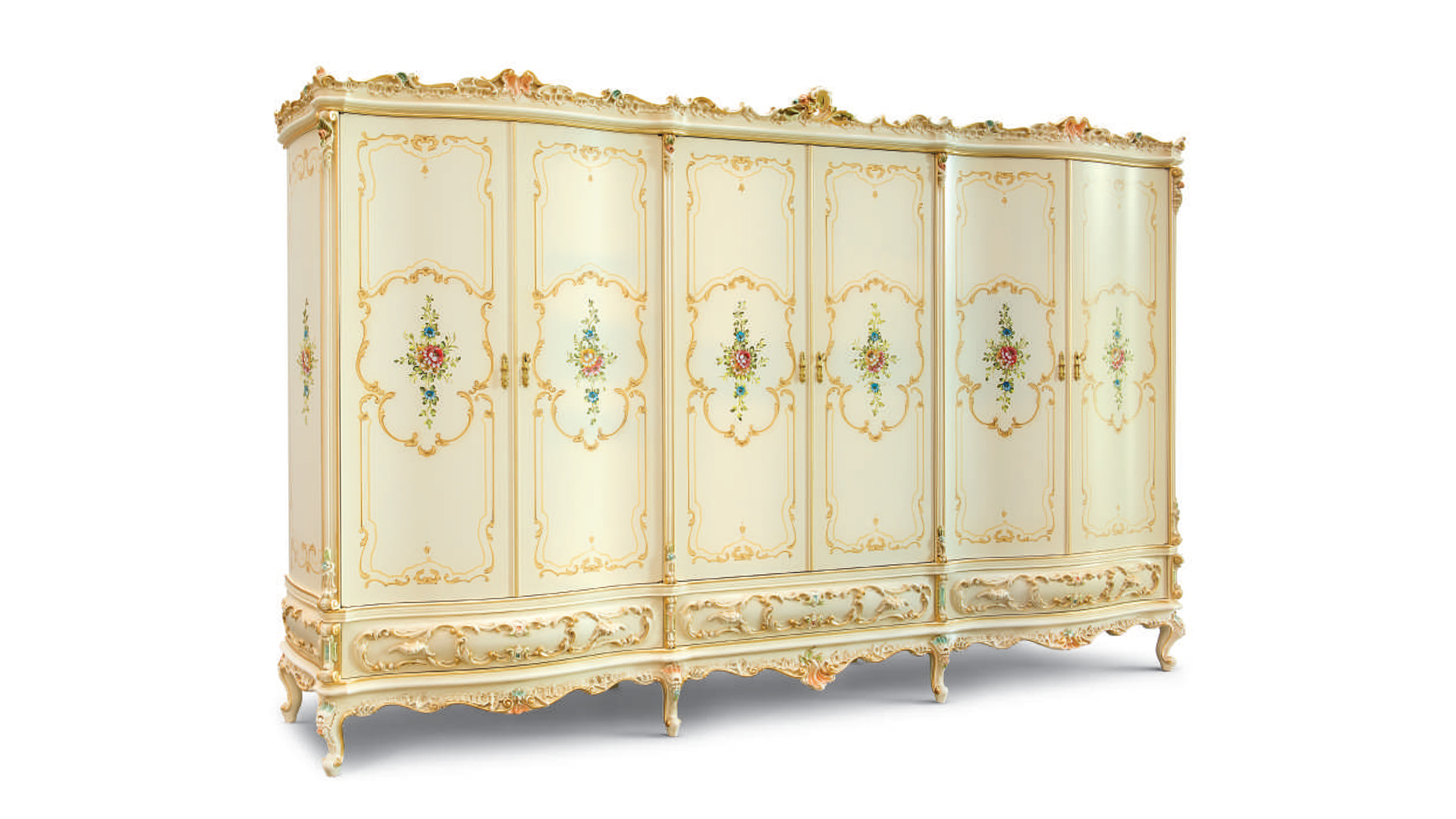 Четырехдверный шкаф. Внутри центральных дверц зеркала. Внутреннее наполнение по желанию заказчика. Декор - пенополиуретан. Возможны другие варианты отделки.
