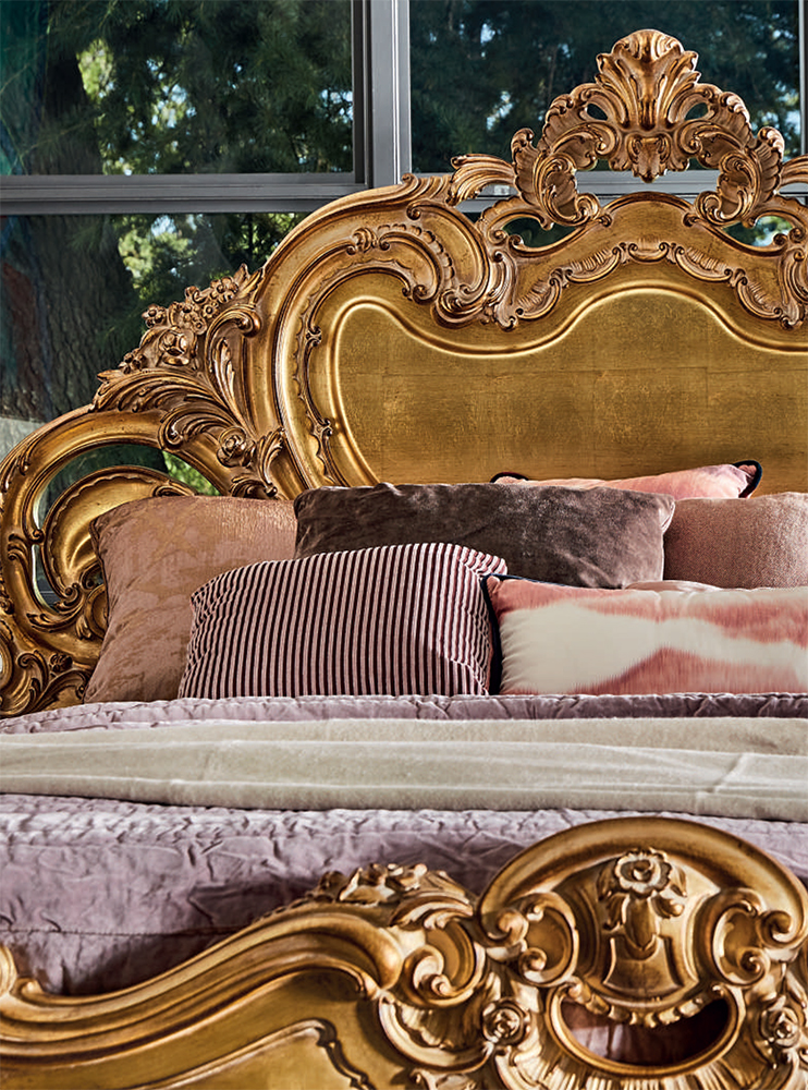 Двуспальная кровать с высоким изголовьем и изножьем (возможен вариант кровати с мягким изголовьем или без изножья). Декор - пенополиуретан, наполнение - полиуретан. Возможны другие варианты отделки.