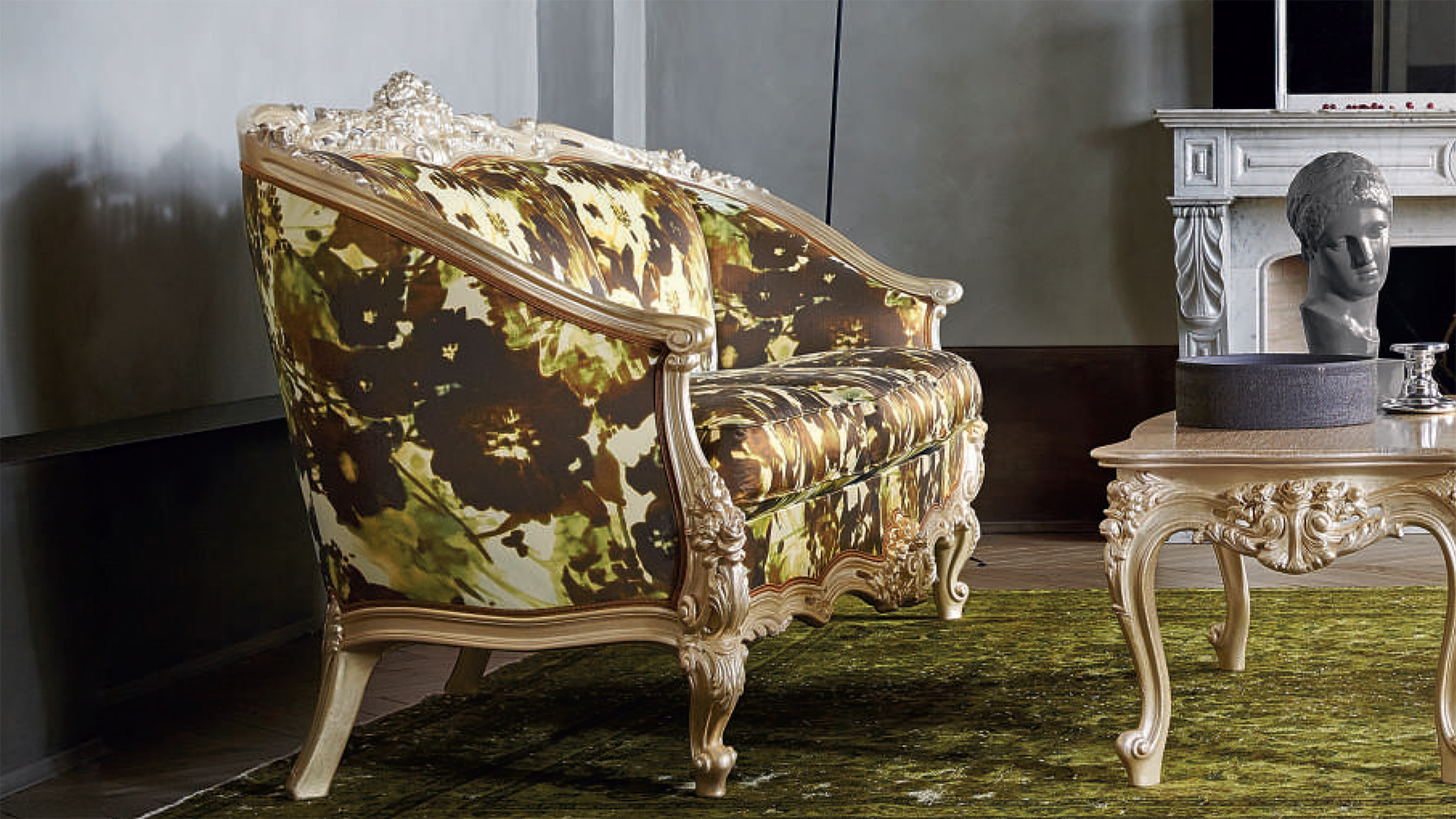 Диван со структурой из дерева. Рама резная и декорирована позолотой. Обивка может быть выполнена из ткани разных видов.