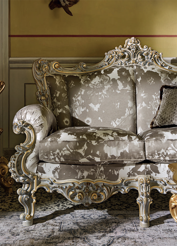 Трехместный диван EOLO изготовлен из дерева. Набивка текстильная с изображением леопарда. Модель украшена декоративной резьбой ручной работы. Подлокотники закруглены.