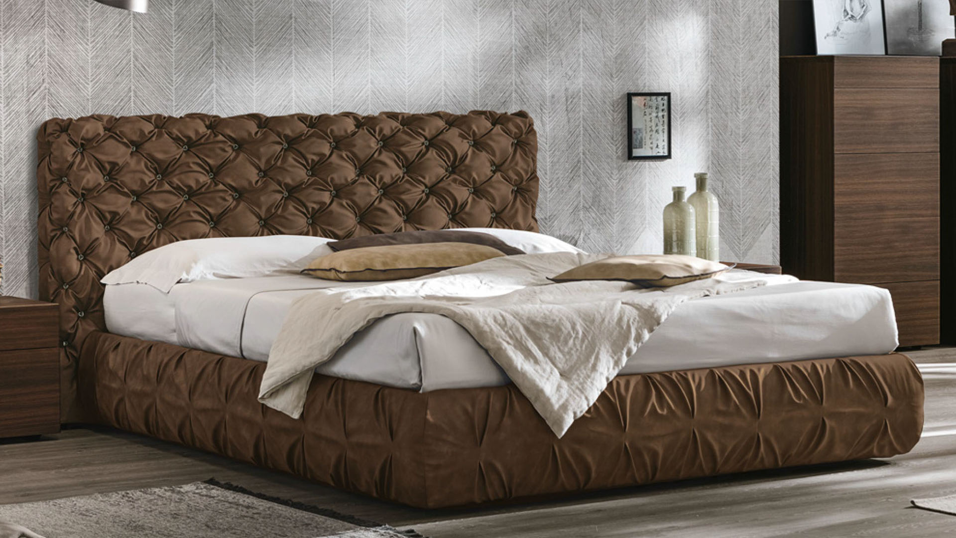 Двуспальная кровать с изголовьем и круговой структурой, обитыми тканью с эффектом «Капитоне», возможны варианты с контейнером и без. Кровать с обработанным задником, серийно поставляется с пуговицами, обтянутыми той же тканью, что и сама кровать. Под заказ за дополнительную плату могут быть установлены пуговицы из кристаллов Swarovski или из состаренного металла.