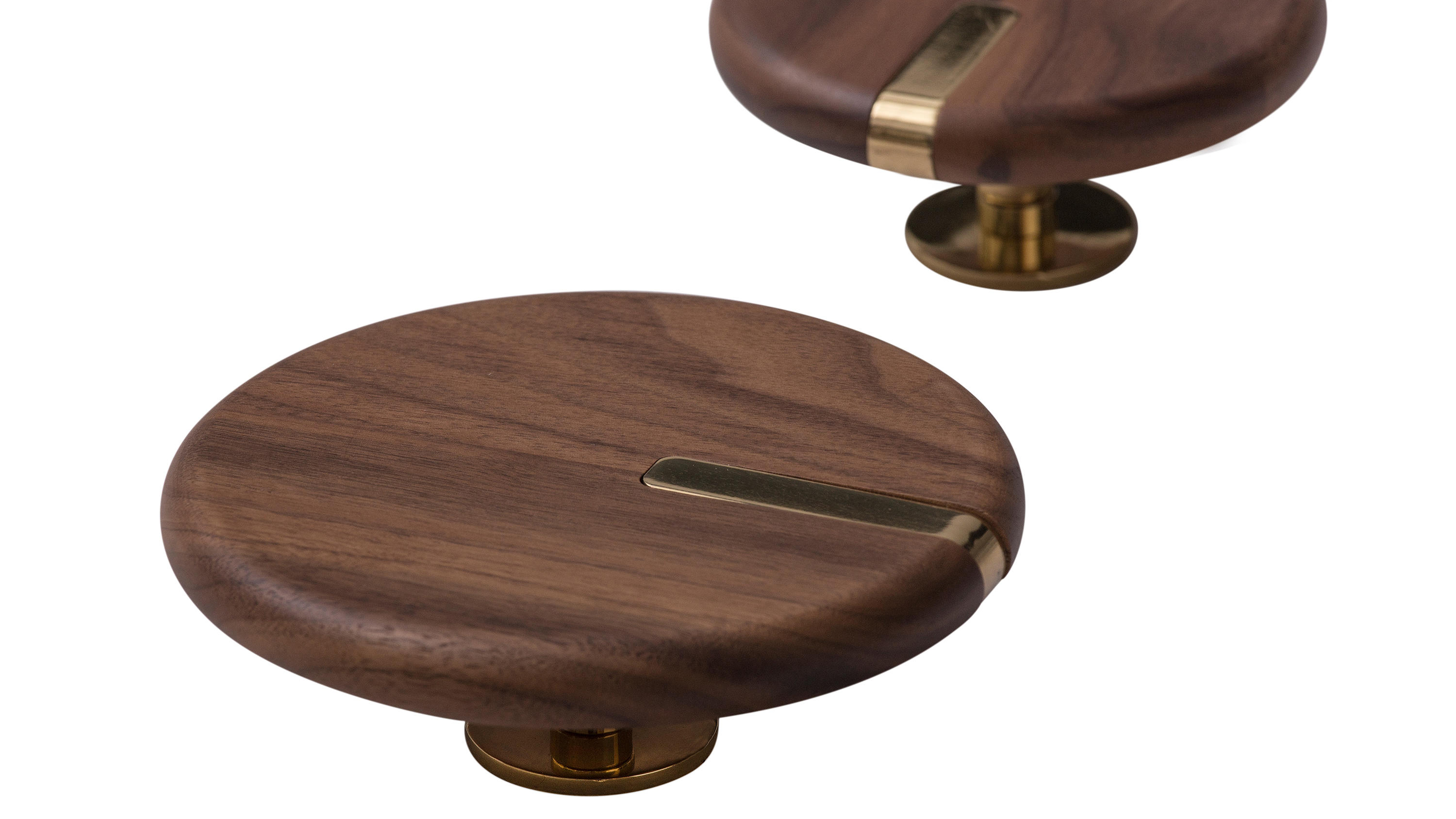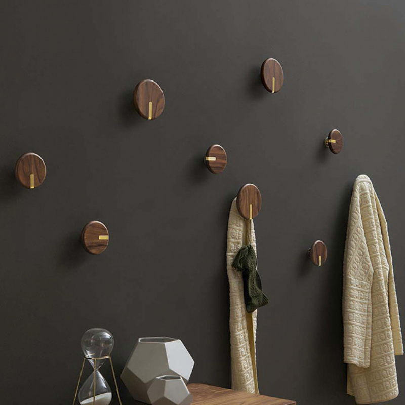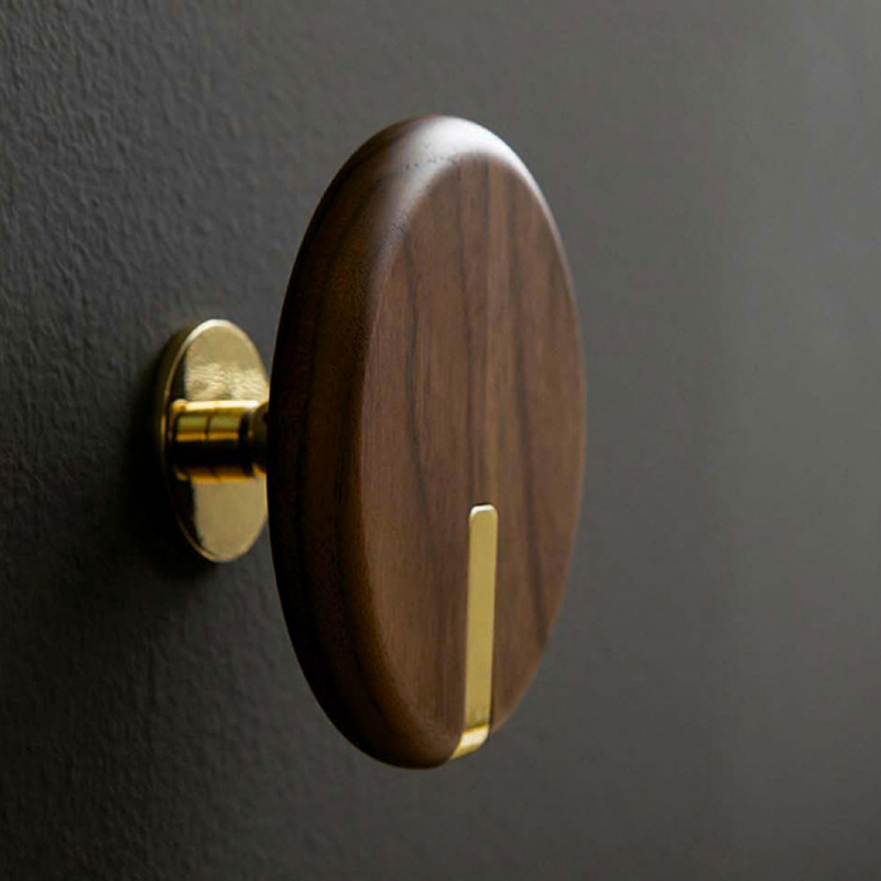 Семейство вешалок из массива дерева, украшенных элегантными деталями с отделкой из золота. Доступны в двух размерах и идеально подходят для постоянного передвижения по стене.