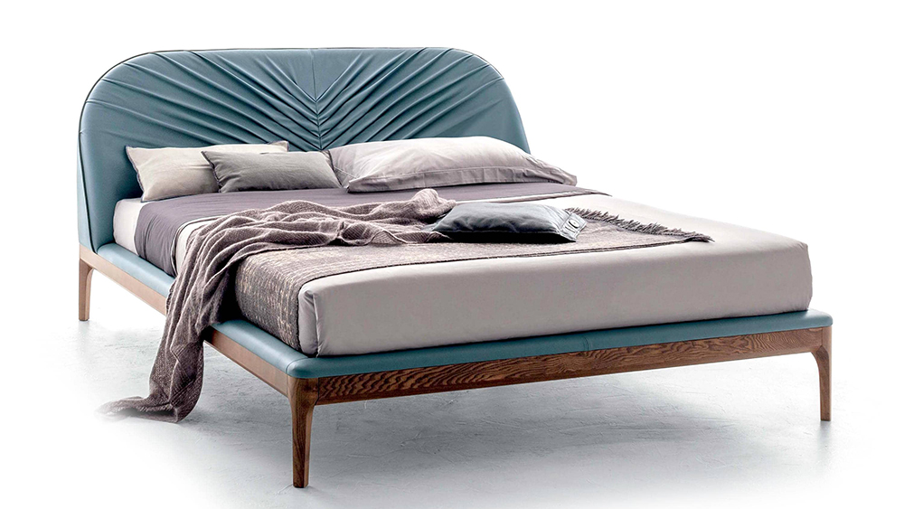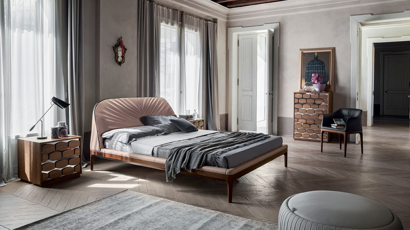Деревянная структура Michelangelo изящная и функциональная, что подчеркивает великолепие спинки кровати, которая является верхом портняжнего мастерства: закругленные, с обивкой из эко-кожи, кожи или зернистой кожи, ее ручное гофрирование создает потрясающий эффект веера. Доступна в разных вариантах отделки.