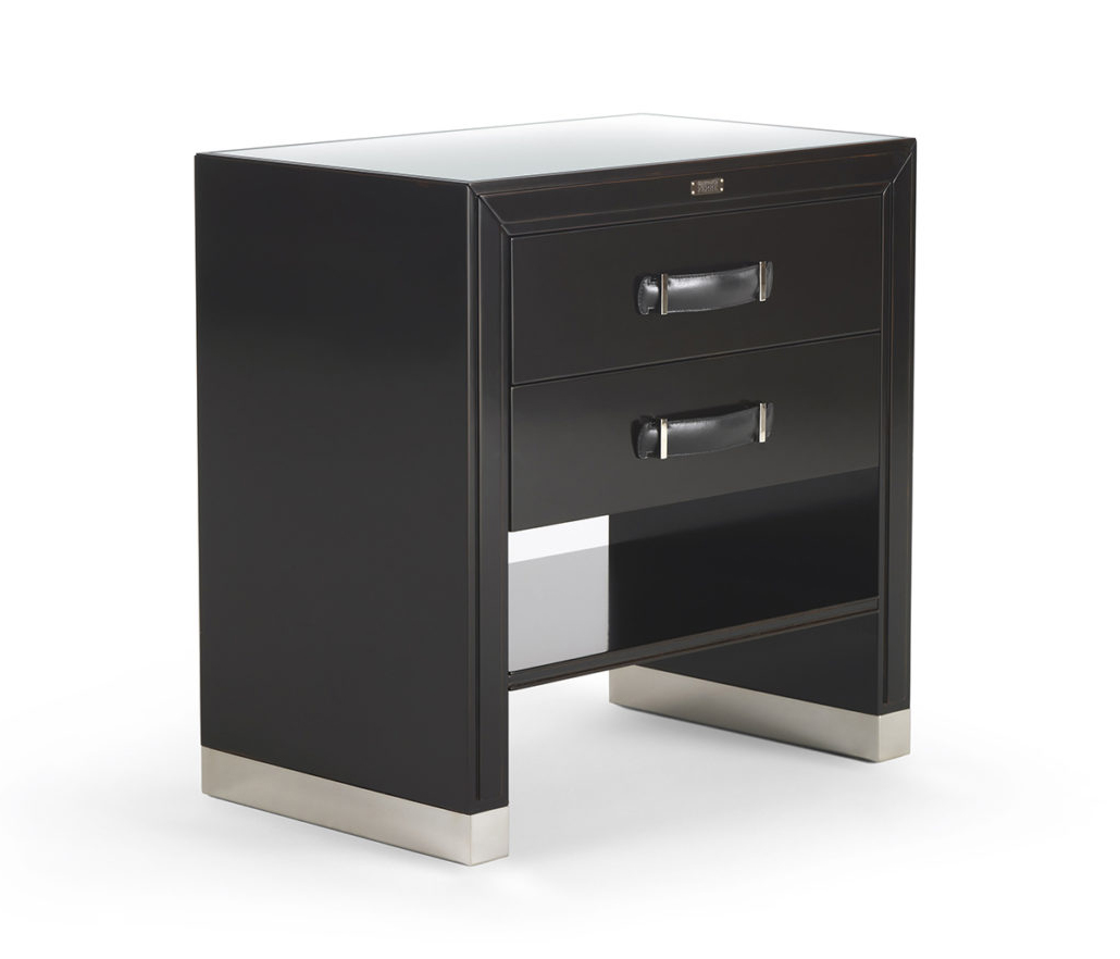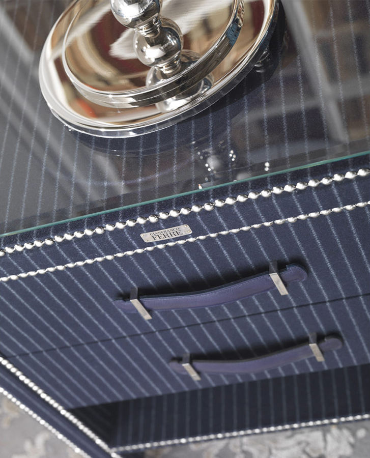 Структура в многослойном тополе. Внешняя сторона обтянута тканью и украшена декоративными металлическими гвоздиками. 2 ящика внутри покрыты микрофиброй. Ручки кожаные. Столешница – стекло. Ножки стальные.