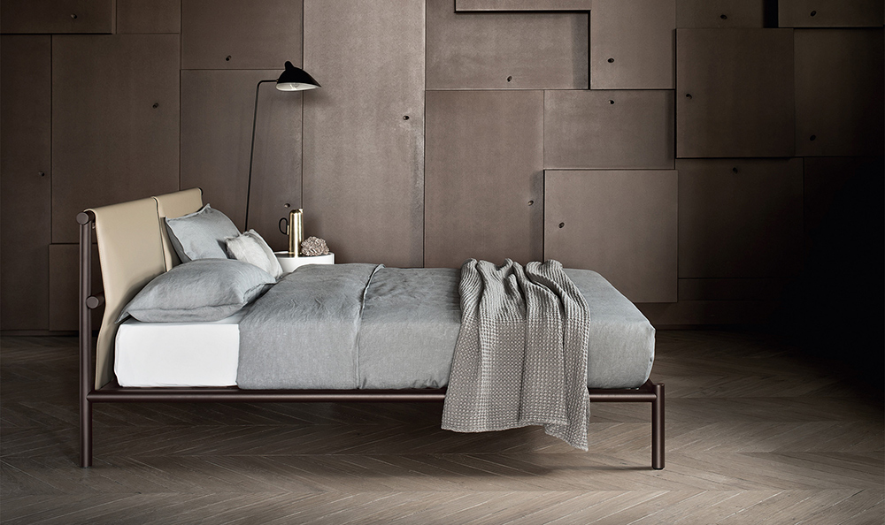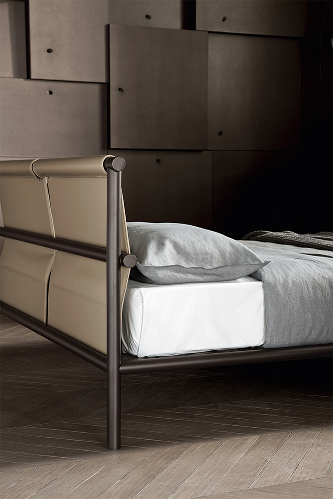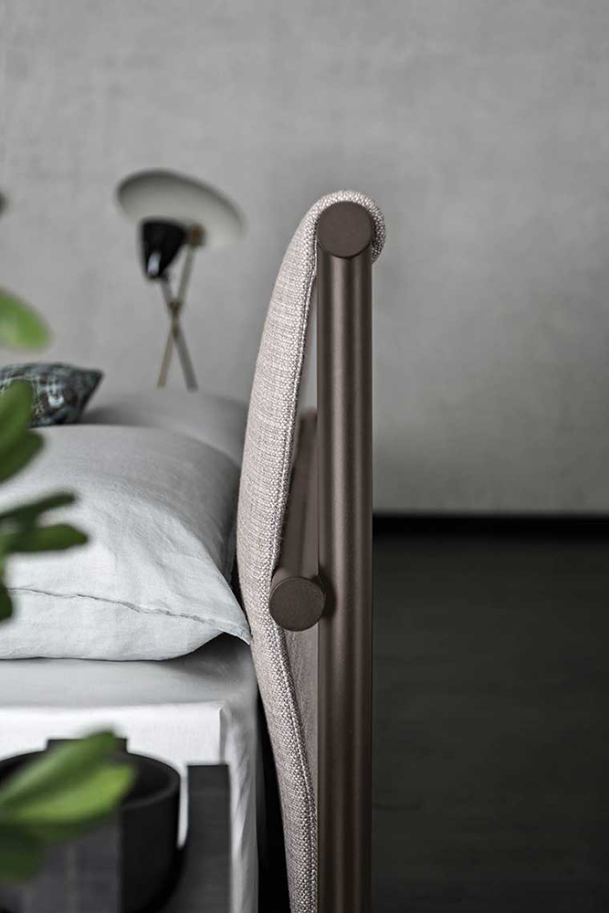 Кровать JETTY, характеризуемая металлическим трубчатым каркасом с отделкой elettrocol, теперь предлагается в новом варианте с тканевой головной спинкой.