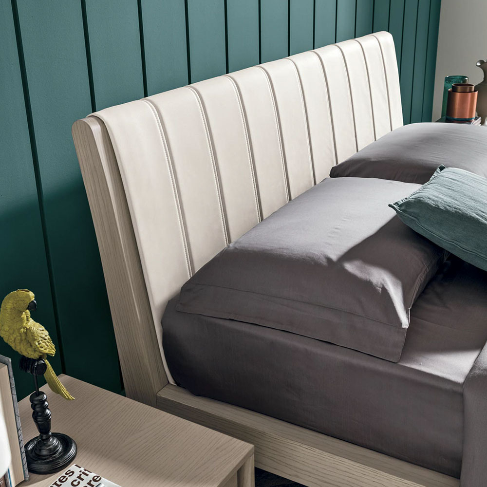 Тканевое или кожаное покрытие оформляет изголовье, подобно драпировке, превосходно сочетаясь с деревом. Вертикальная строчка придает кровати роскошный вид, выявляя в деталях мастерское исполнение.