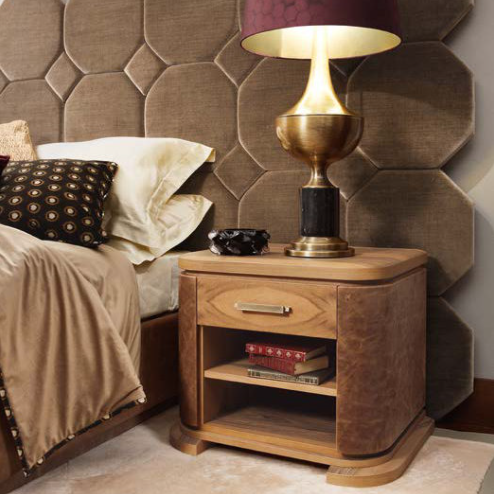 Кожа подчеркивает текстуру дерева, а дерево отражает сталь ручки. Все это делает Ermete идеальной тумбочкой для классических спален с современными элементами.