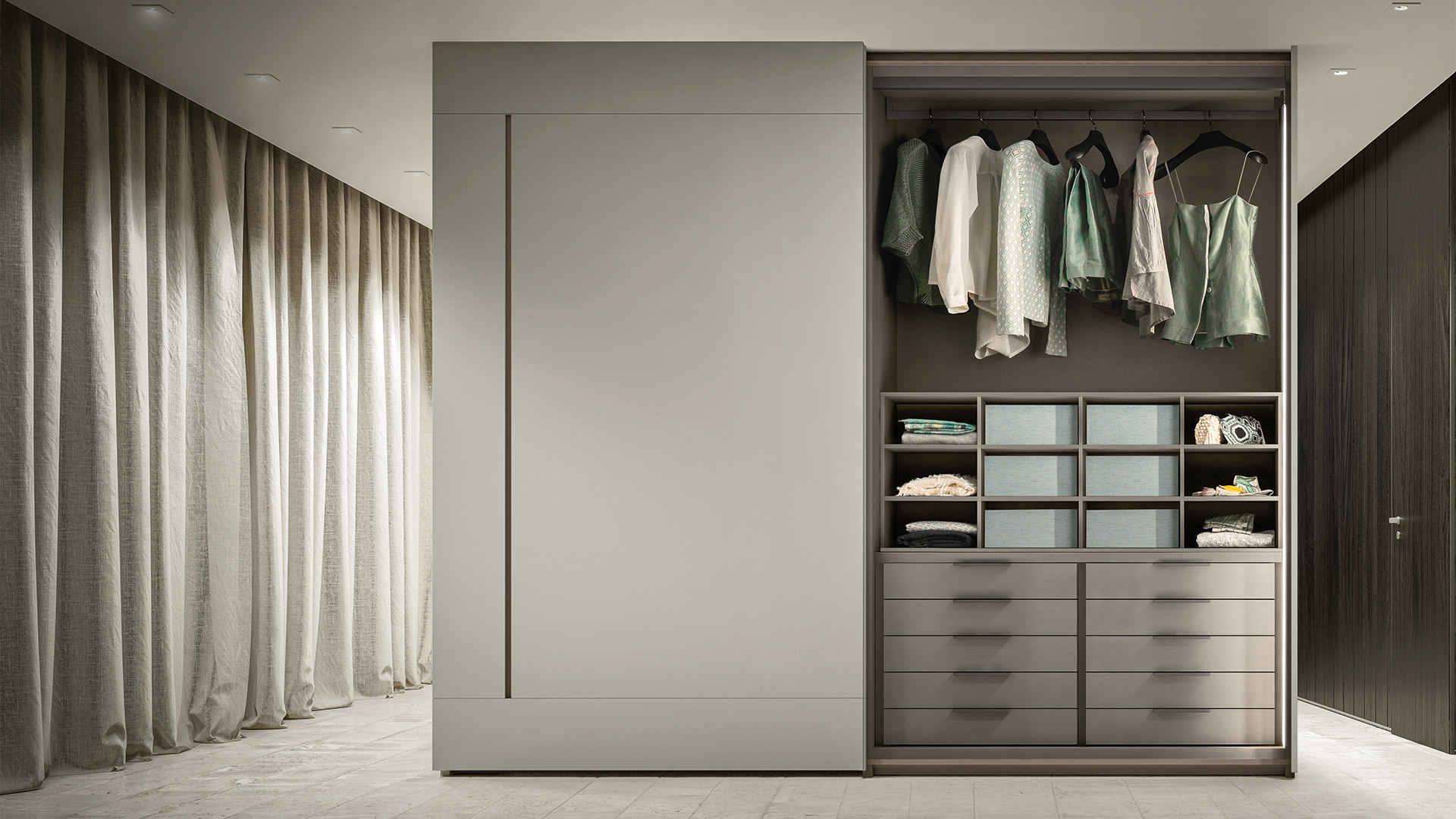 Гардероб Glide доступен с раздвижными или копланарными дверями и имеет встроенную ручку. Это элемент, от которого невозможно отказаться в респектабельной спальне, хорошо обставленной и функциональной.