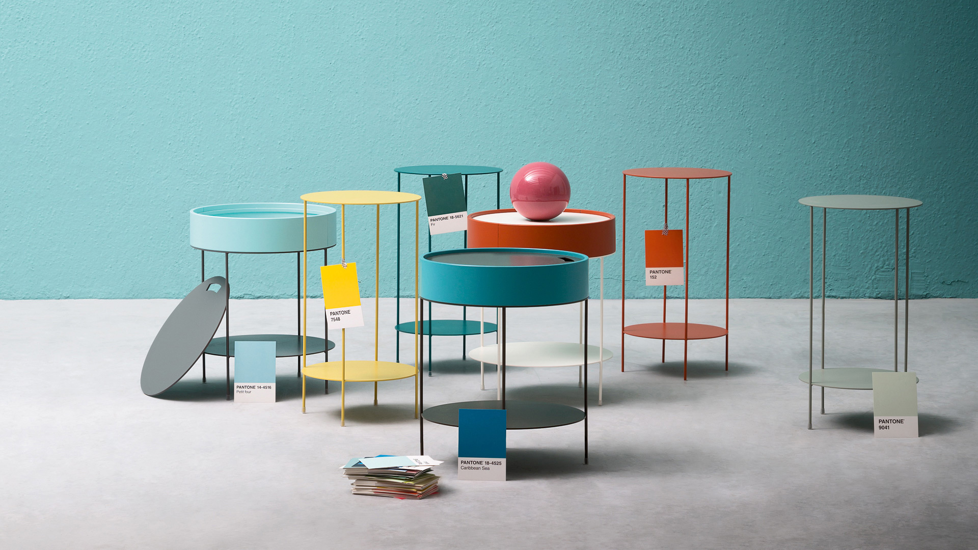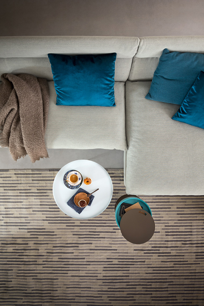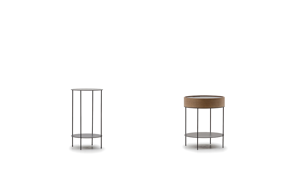 Wok is a round occasional table with a metal structure. Wok Box differs in that it has a wooden storage unit at the top, which is topped off by a cover that turns into a practical tray with a shaped handle when necessary.
