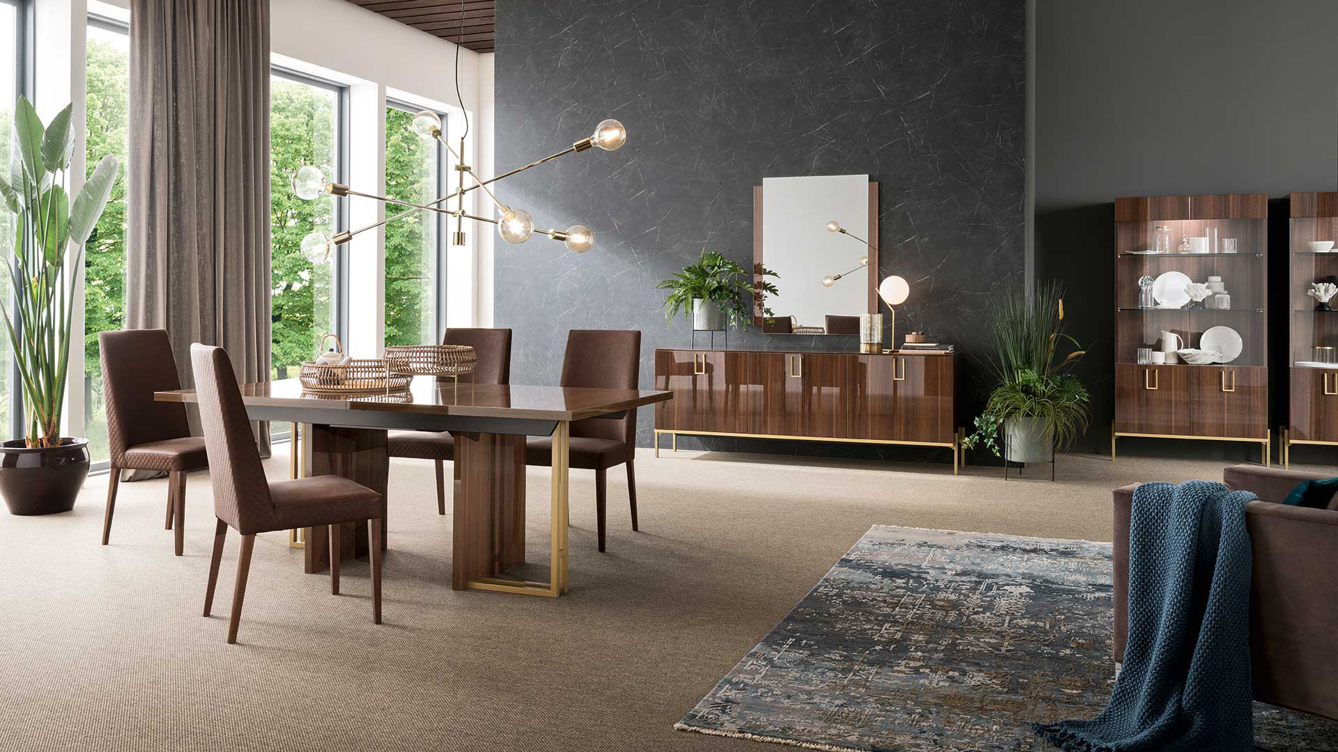 Mid Century dining set is made in brown walnut High Gloss lacquer with a perfectly matching golden finish used for the metal parts.