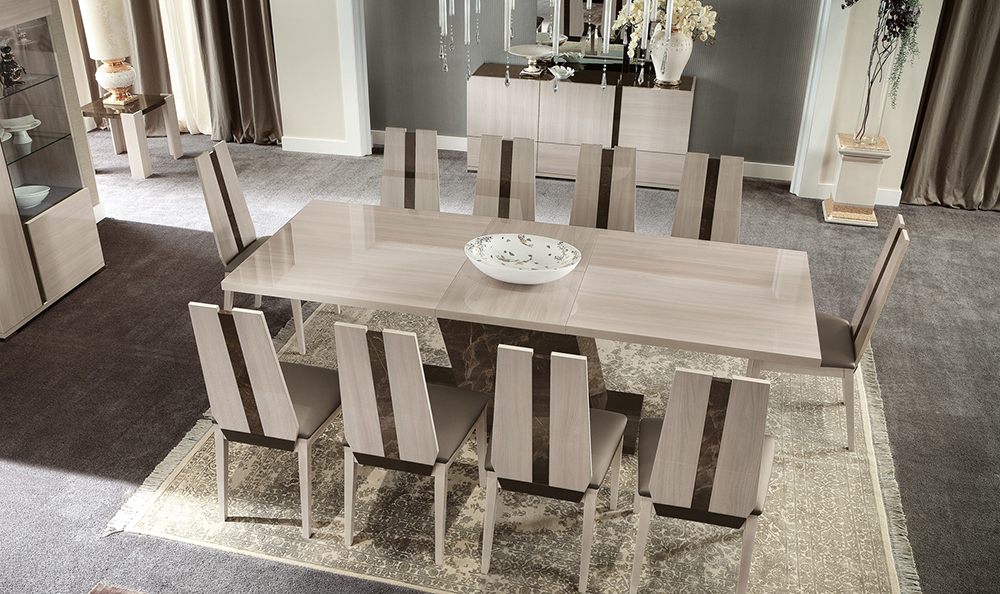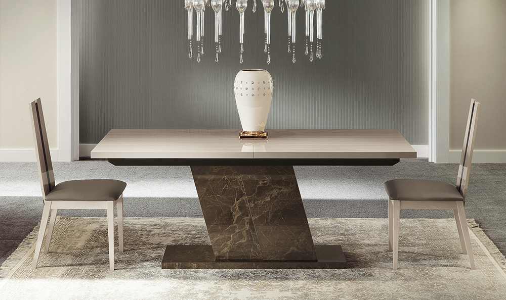 The Teodora Dining Table defines luxury and emphasizes modern design with elegant aspects. This table features finishes of Light Elm Veneer & Emperador Stone that are exquisitely mixed with perfect balance and Chrome accents.