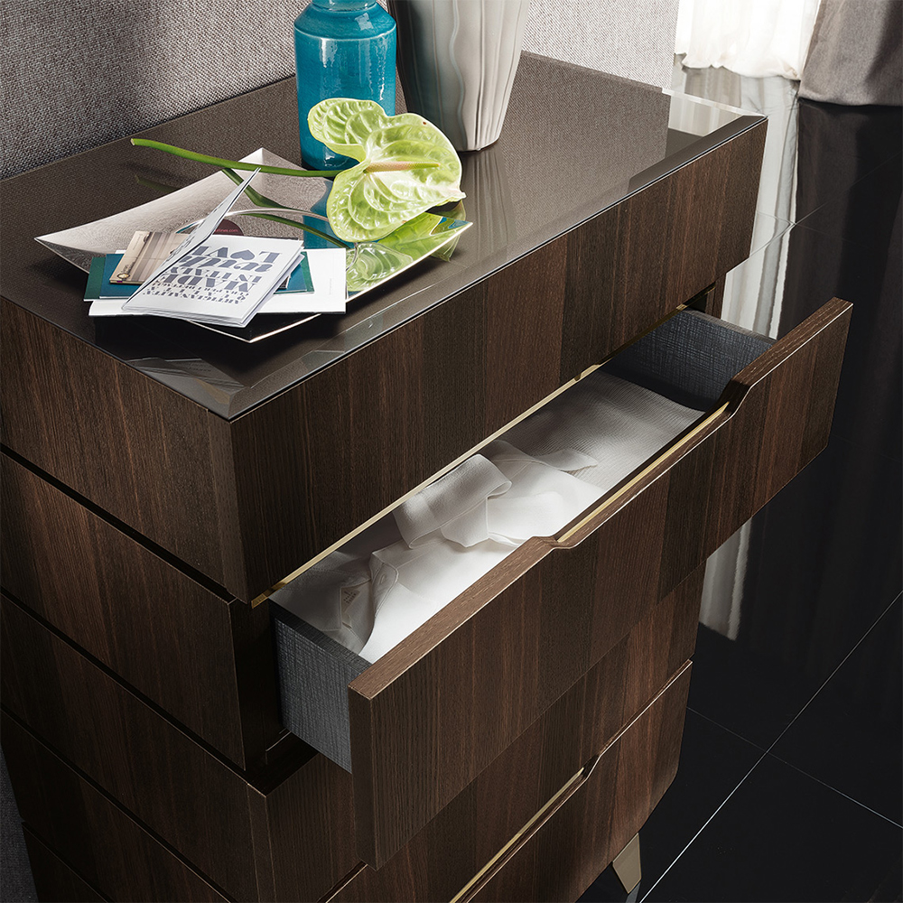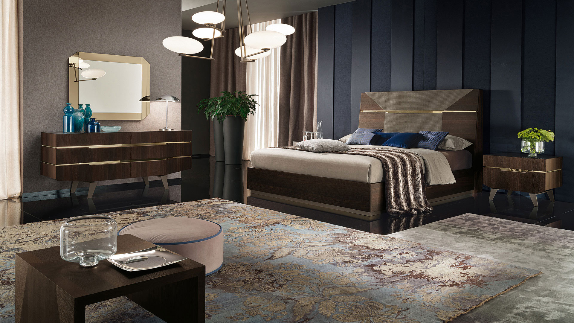 The Accademia bed is crafted in a beautiful and warm Termocotto Oak finish. The beautiful headboard is composed of quilted upholstery that inlays the bed within the beautiful Termocotto Oak. It is fitted with Led lights and golden accents. This piece is imported from Italy.