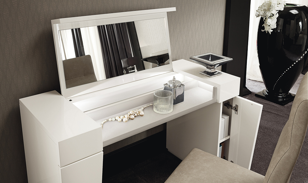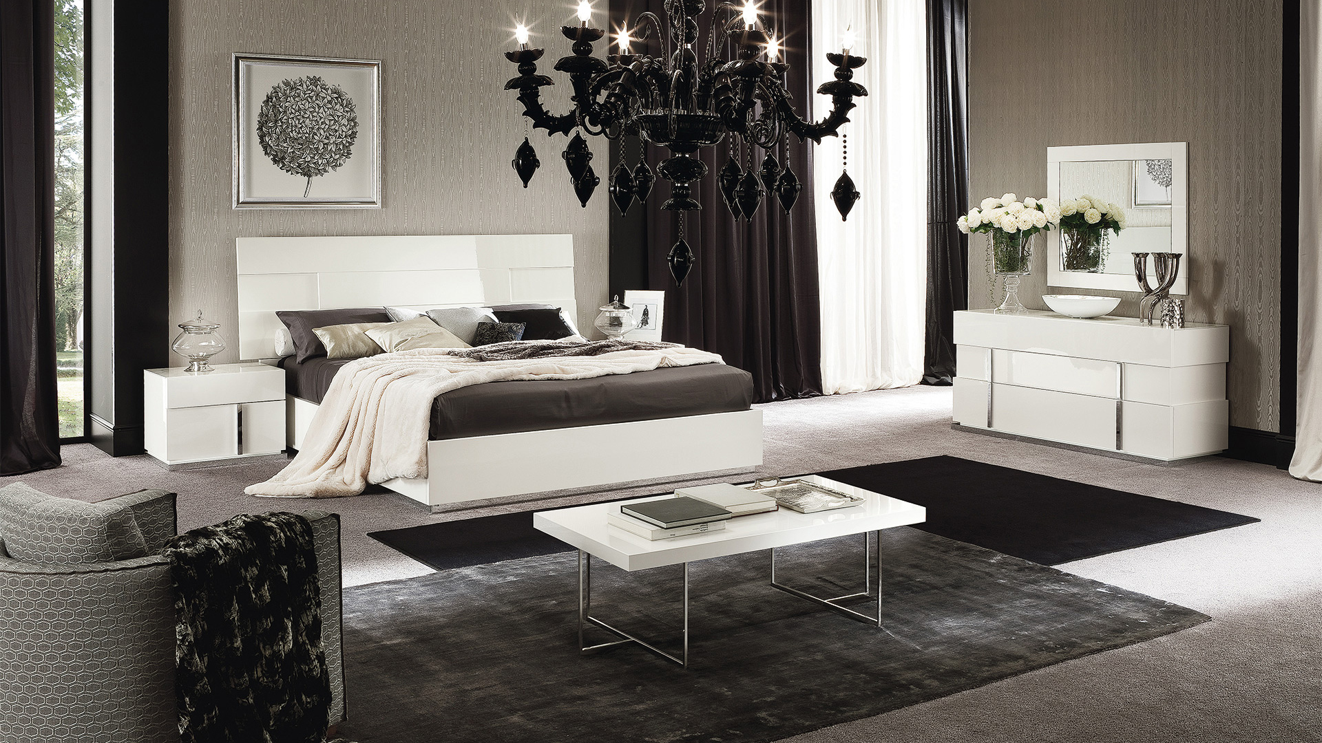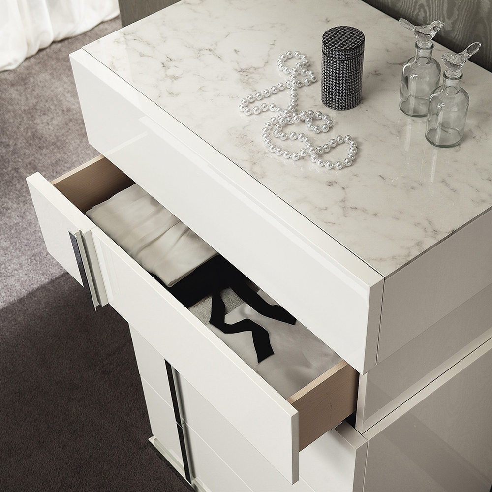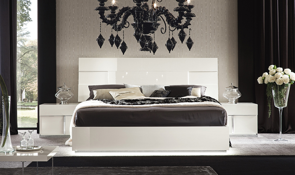 This set features an elegant White High Gloss finish, Chrome accents, and luxurious White Carrara Marble finished tops on the nightstand, chest & dresser. The LED Light Kit enhances the overall design of the Canova by illuminating under the bed and within the headboard.