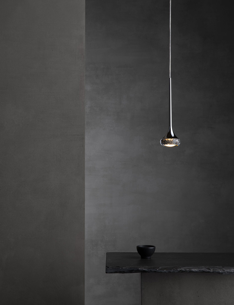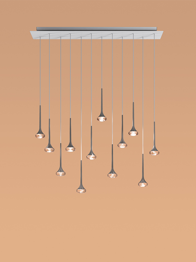 Multiple reflections and iridescent symmetries go through the matter to generate new forms. The clarity of aluminum meets the facets of the crystal in a kaleidoscopic game of unpredictable brilliance.
