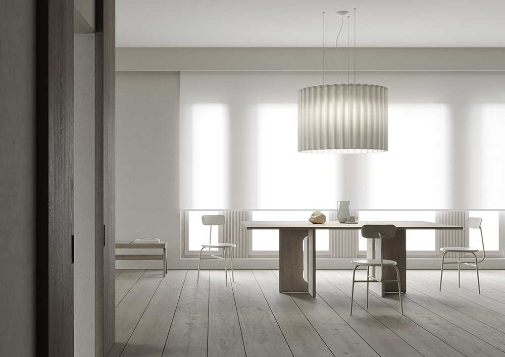 Skirt takes inspiration from the world of fashion, in particular from the garment of the same name. The result is a collection of pendant lamps with a unique and elegant design, given by its sinuous shapes. A collection that can be the focal point of an environment, without surmounting the other elements. A refined design that allows Skirt to adapt to different types of environments, from domestic to contract and hospitality. Its lampshade is composed of a fabric that also has sound-absorbing properties, which allow it to reduce noise by up to 53%, thanks to its Equivalent Absorption Area which reaches a maximum of 3.55.