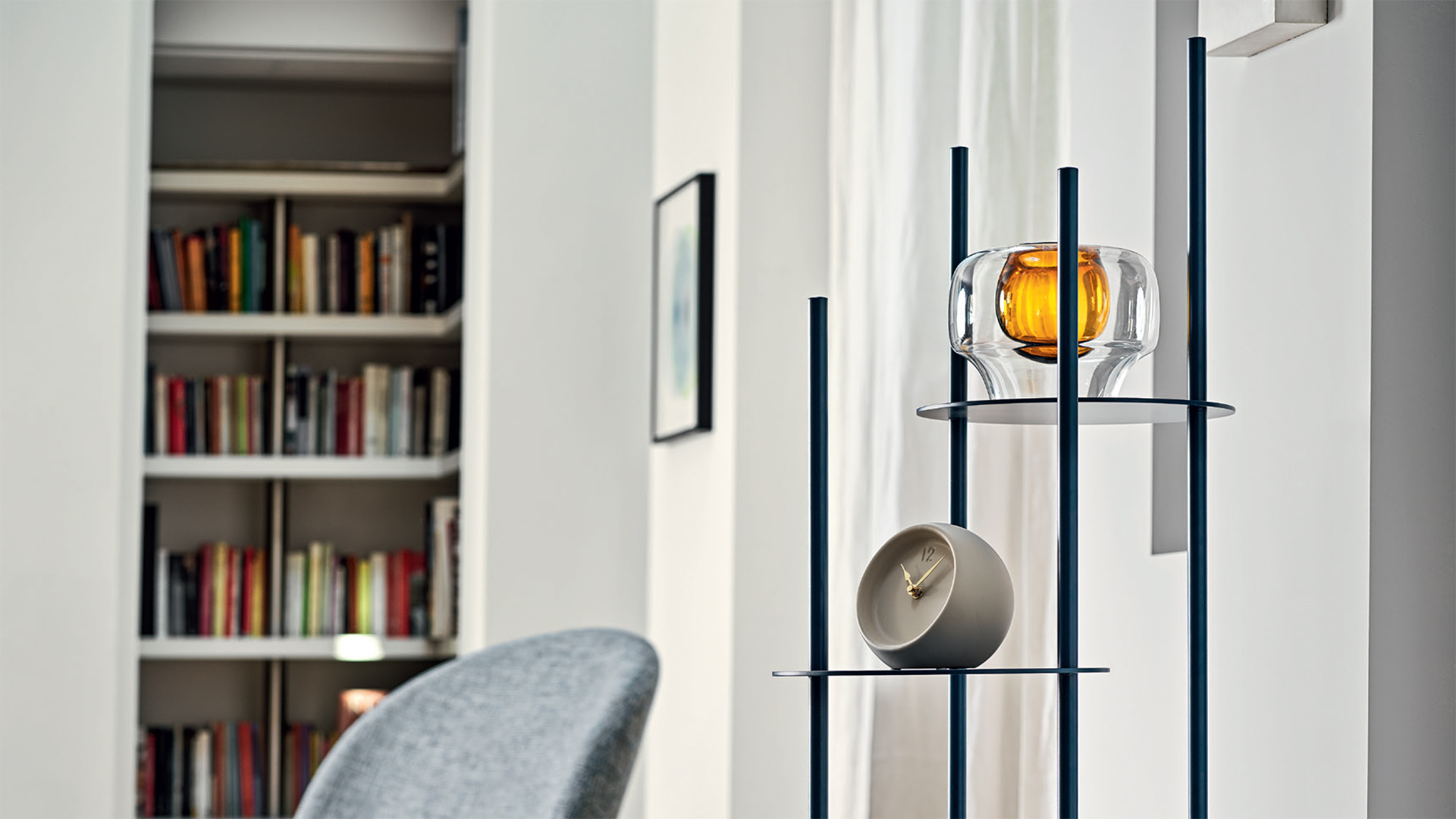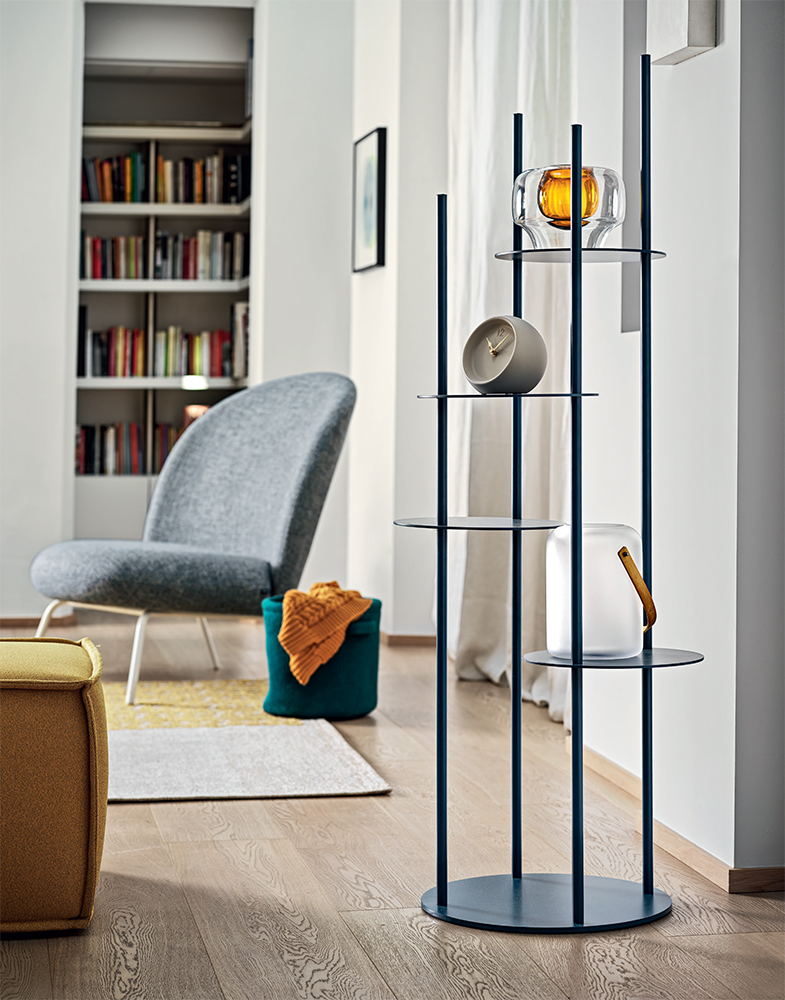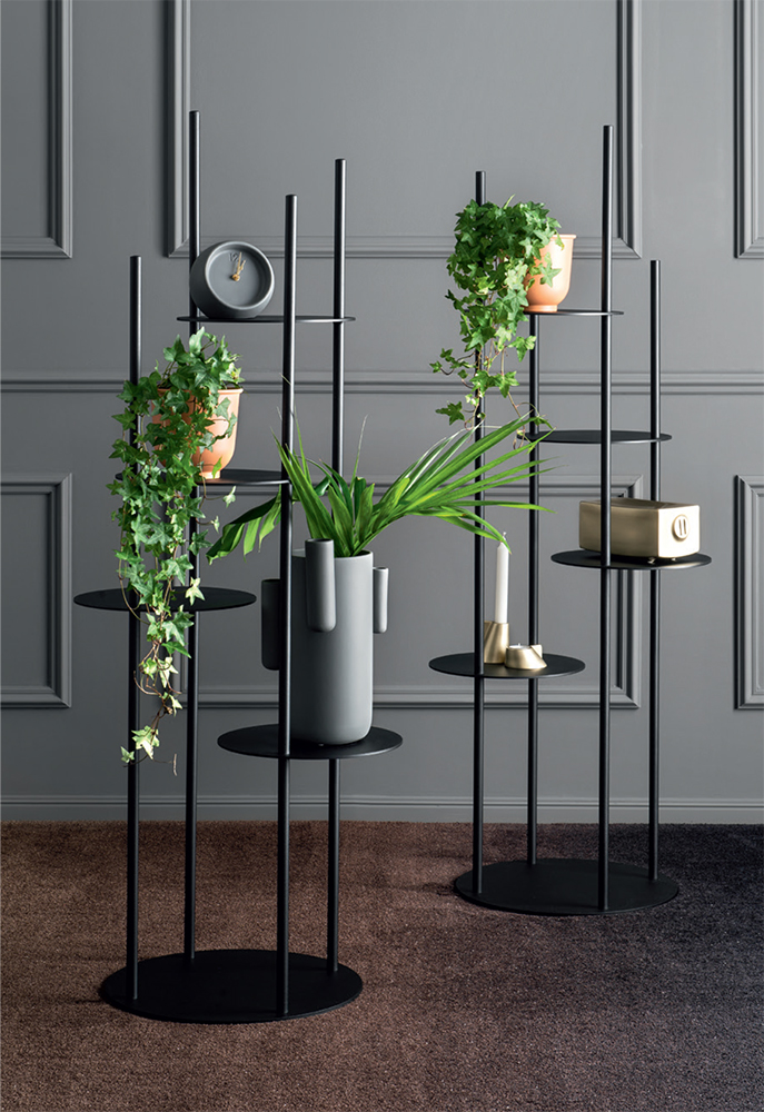 This design piece puts a new slant on furnishing accessories. Circles is a highly original way to keep your most important belongings in view without taking up too much space. This columnar totem in tubular metal has 4 circular metal sheet shelves. Made to match the column, the circular shelves have been placed at different heights and the tubular rods also come in differing heights, creating a visually striking arrangement.
