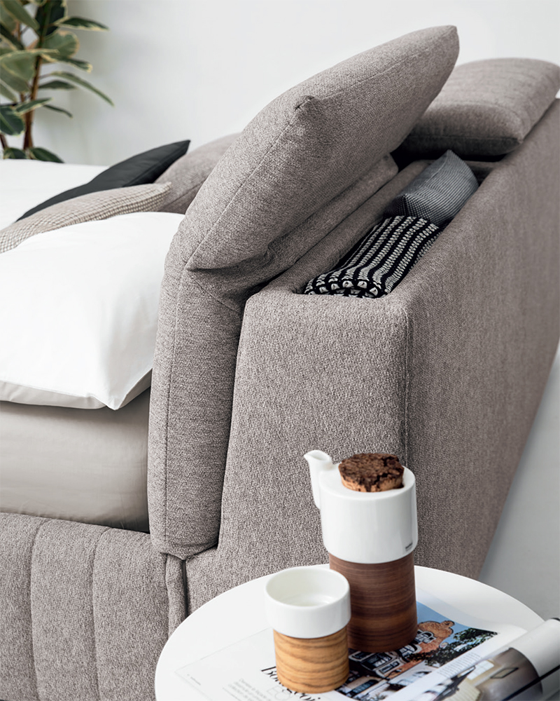 The idea underpinning this product comes from reclaimed padded seats from exclusive luxury vintage trains and features soft vertical quilting that tempers the grandeur of the generously voluminous design. When the headboard is opened, Portland offers a practical functional container unit for storage. The item is available with three versions of the feet in wood and one in metal with the option of choosing the look and height from the ground that suits the customer best. The Portland bed is available with a fixed bed base or container unit. Can be upholstered in fabric or leather.
